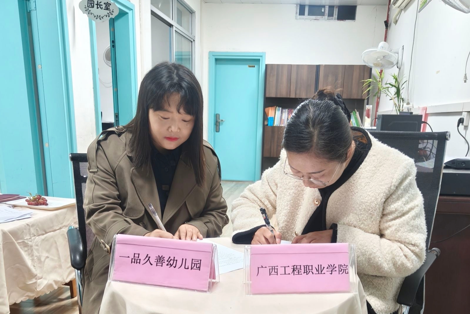 2025年12月5日,廣西工程職業(yè)學院教育學院與平果市一品久善幼兒園合作簽約儀式在幼兒園內(nèi)順利舉行。雙方正式確立合作關系,共同致力于學前教育人才的培養(yǎng)與實踐教學的深化。