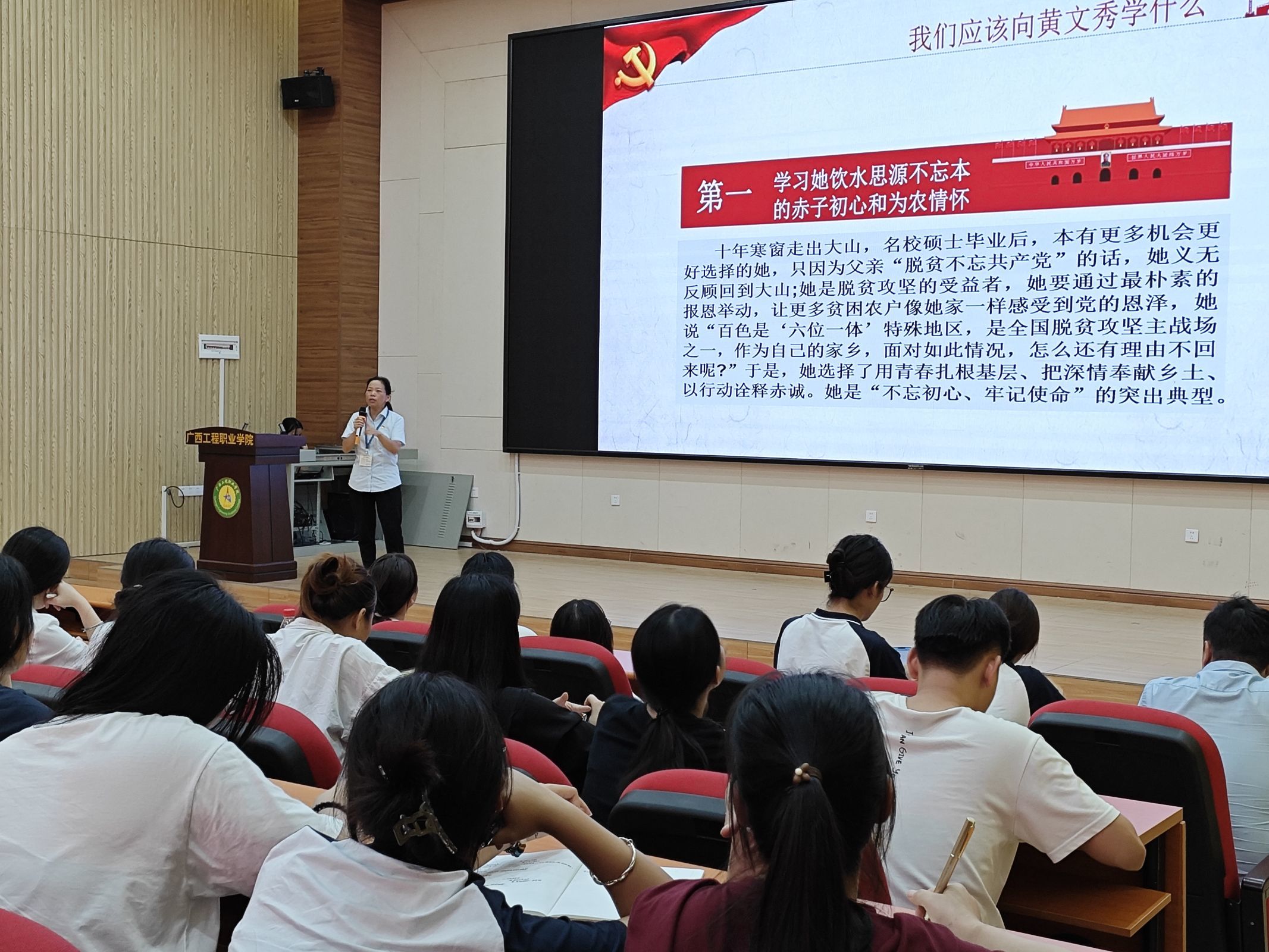 龐英連從四個方面進行授課:一是學習黃文秀的精神內(nèi)涵;二是我們應該向黃文秀學什么;三是學習黃文秀做新時代的好榜樣;四是學習黃文秀精神,做新時代有為青年。她強調(diào),我們要學習黃文秀同志飲水思源不忘本的赤子初心和為農(nóng)情懷;學習她不讓一個困難群眾掉隊的堅實信念和堅定信仰;學習她不獲全勝不撤退的使命擔當和扶貧精神。