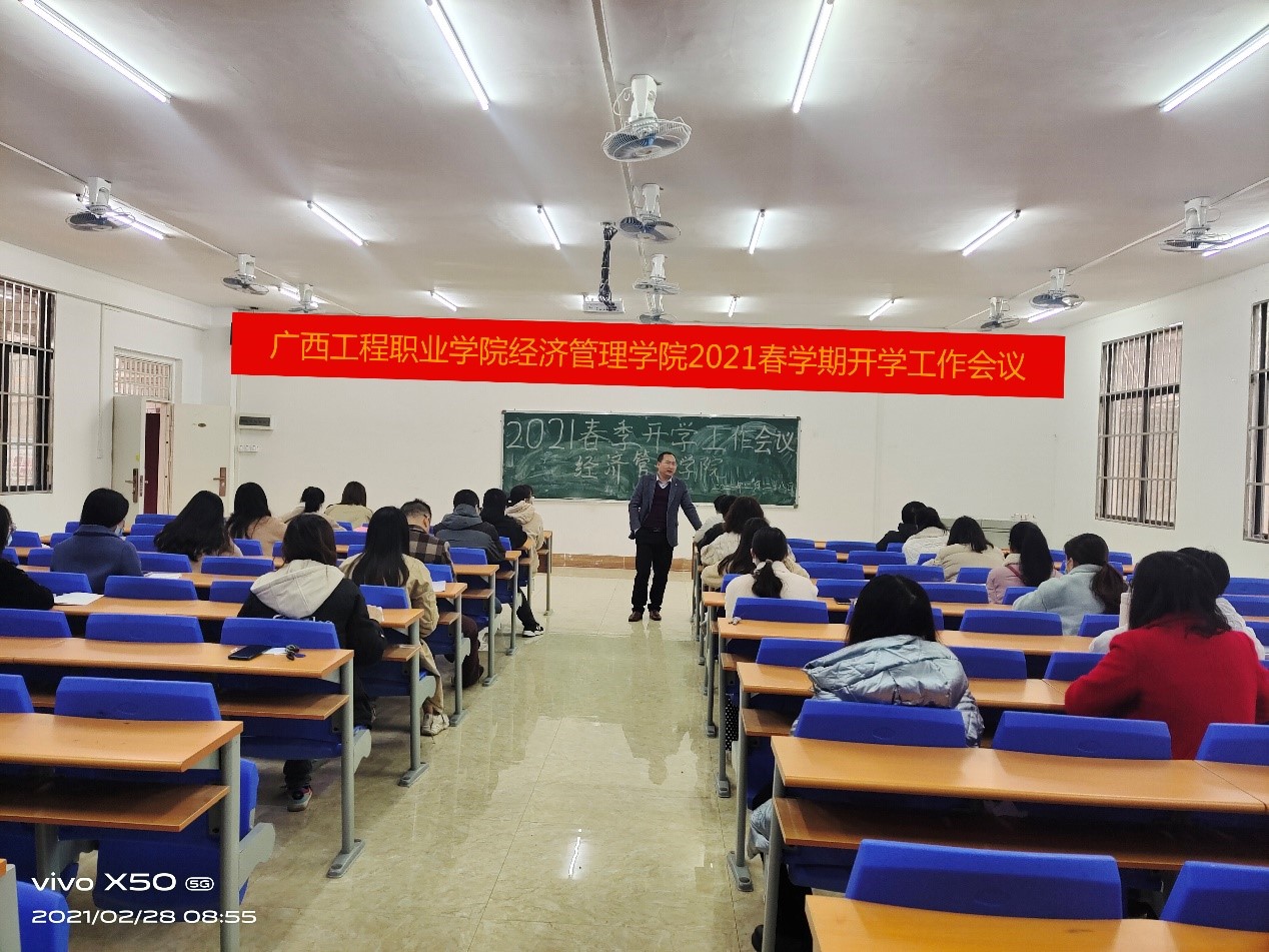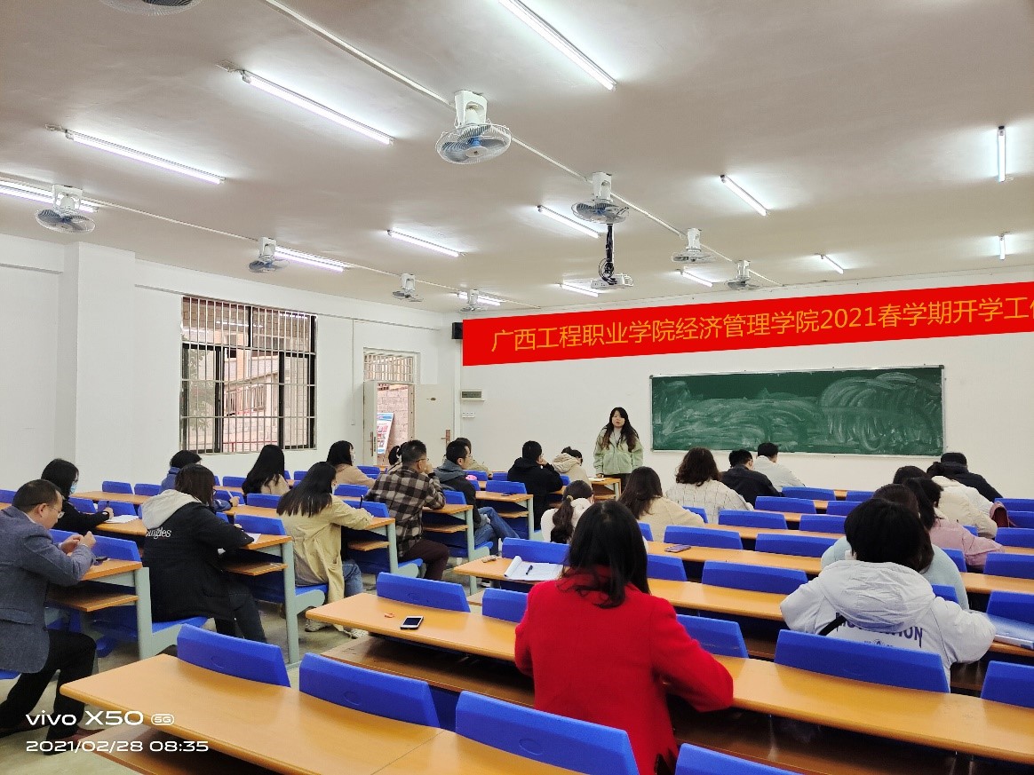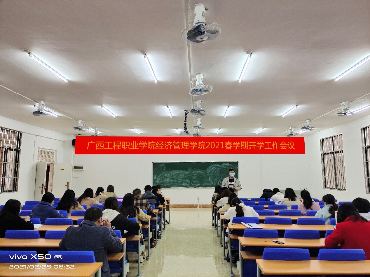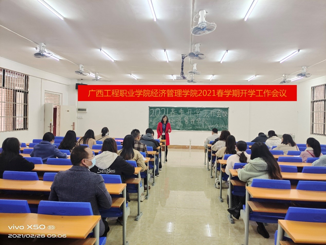 為了確保新學(xué)期各項(xiàng)工作的有序開(kāi)展,2021年2月28日上午,經(jīng)濟(jì)管理學(xué)院在404會(huì)議室召開(kāi)新學(xué)期教學(xué)工作會(huì)議,學(xué)校副校長(zhǎng)彭高彬、經(jīng)濟(jì)管理學(xué)院副院長(zhǎng)覃清香、辦公室主任雷紅、分團(tuán)委書(shū)記學(xué)生科科長(zhǎng)李東英及全體經(jīng)濟(jì)管理學(xué)院教師參加會(huì)議。會(huì)議由覃清香副院長(zhǎng)主持。