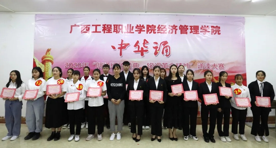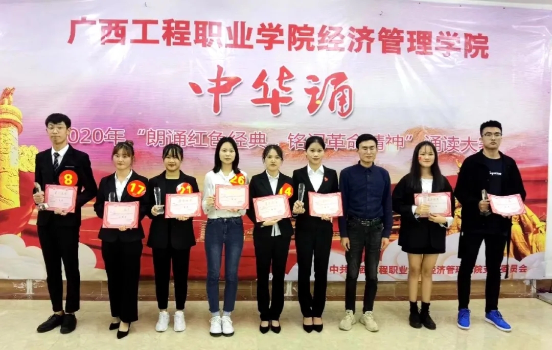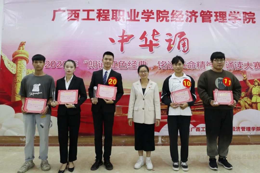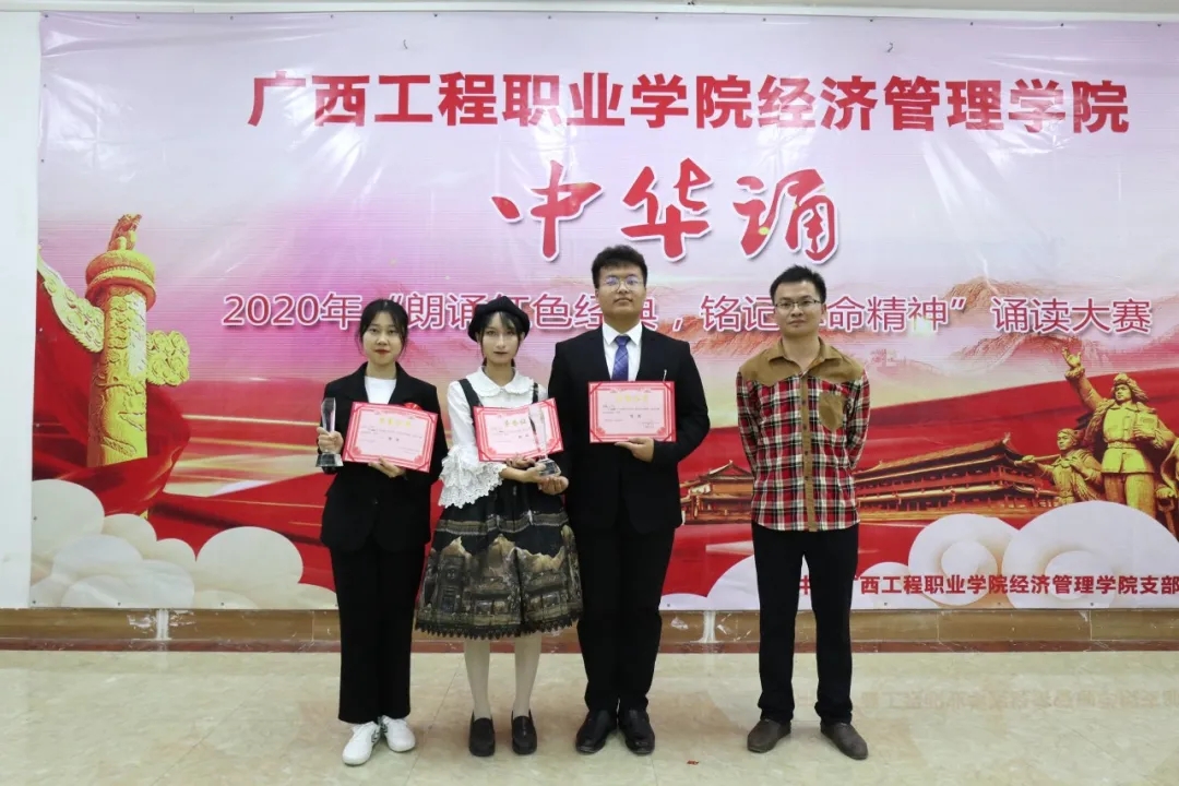這次比賽展現(xiàn)出廣西工程職業(yè)學(xué)院學(xué)子優(yōu)秀的素質(zhì)和良好的精神風(fēng)貌。更值得一提的是,為了使朗誦表演錦上添花,最后經(jīng)濟(jì)管理學(xué)院文娛部的黃建偉同學(xué),身著一身紅色大褂表演了一段相聲快板。最后2號(hào)3號(hào)憑借他們完美的演繹榮獲本次比賽的一等獎(jiǎng)。