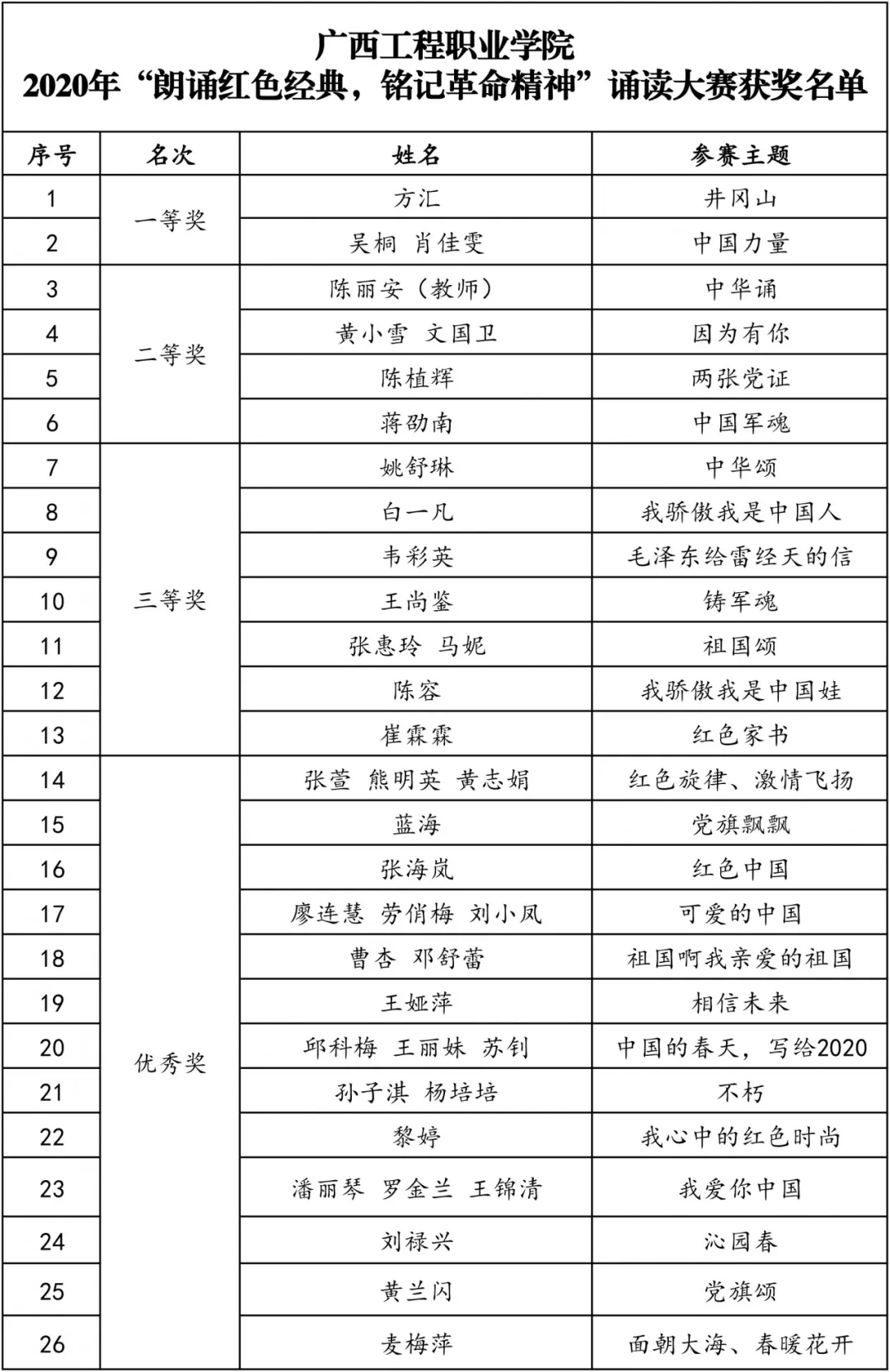 經(jīng)過激烈的角逐,朗誦作品《井岡山》、《中國力量》榮獲本次比賽的一等獎(jiǎng);