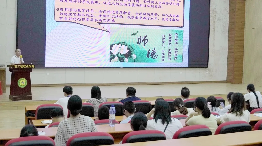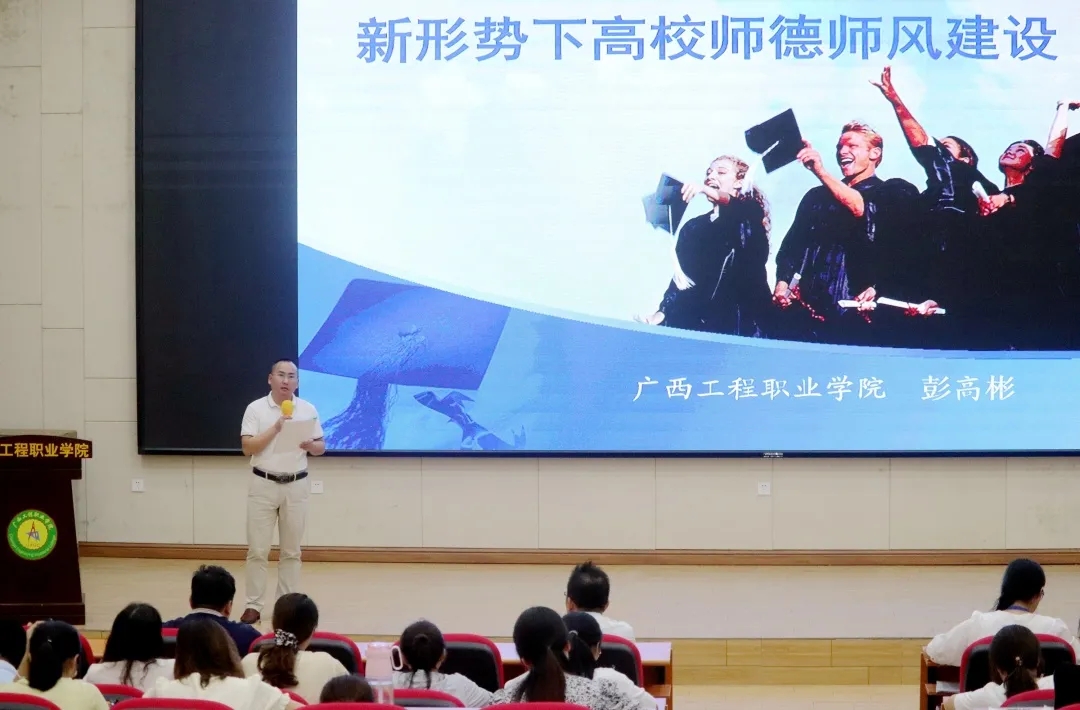 彭高彬副校長以“新形勢下高校師德師風(fēng)建設(shè)”為主題,從加強教師職業(yè)道德建設(shè)的重要意義、高校教師職業(yè)道德規(guī)范、廣西工程職業(yè)學(xué)院教師職業(yè)道德規(guī)范、新形勢下應(yīng)著重突出的師德內(nèi)涵等四個方面,結(jié)合自身的教育教學(xué)經(jīng)歷及師德規(guī)范典型事例,用幽默風(fēng)趣的語言,深入淺出地闡述了如何成為一名好教師。