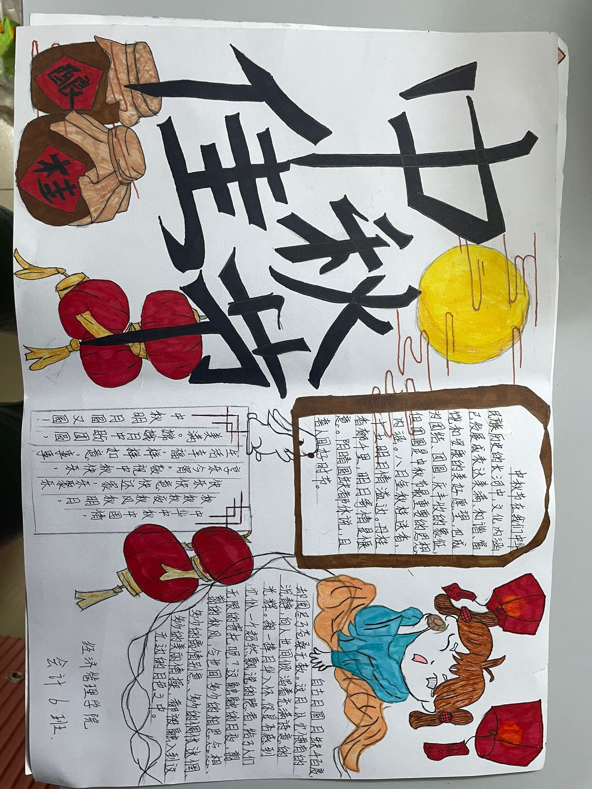 以中秋節(jié)為主題的手抄報(bào)。用古人詩詞鑒賞中秋同學(xué)們開展手寫祝福活動(dòng),通過書寫古詩、祝福語,表達(dá)對(duì)家人的思念和對(duì)親友的祝福,加強(qiáng)對(duì)傳統(tǒng)文化和節(jié)日的了解。開展班會(huì)以中秋為主題認(rèn)識(shí)中秋節(jié)的由來和通過開展賞花燈猜燈謎活動(dòng),讓師生感受到傳統(tǒng)節(jié)日的魅力,增強(qiáng)民族自豪感和文化自信。