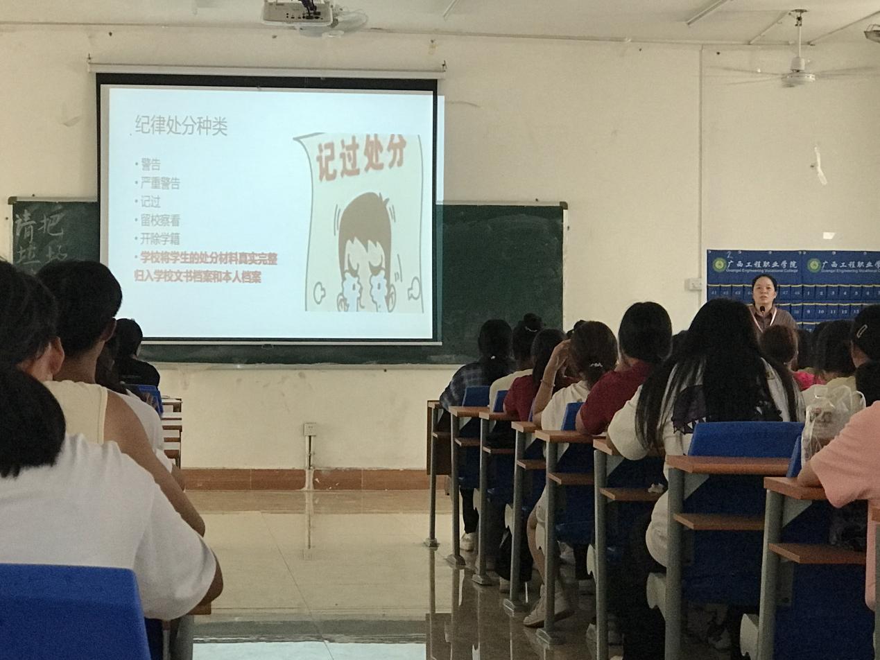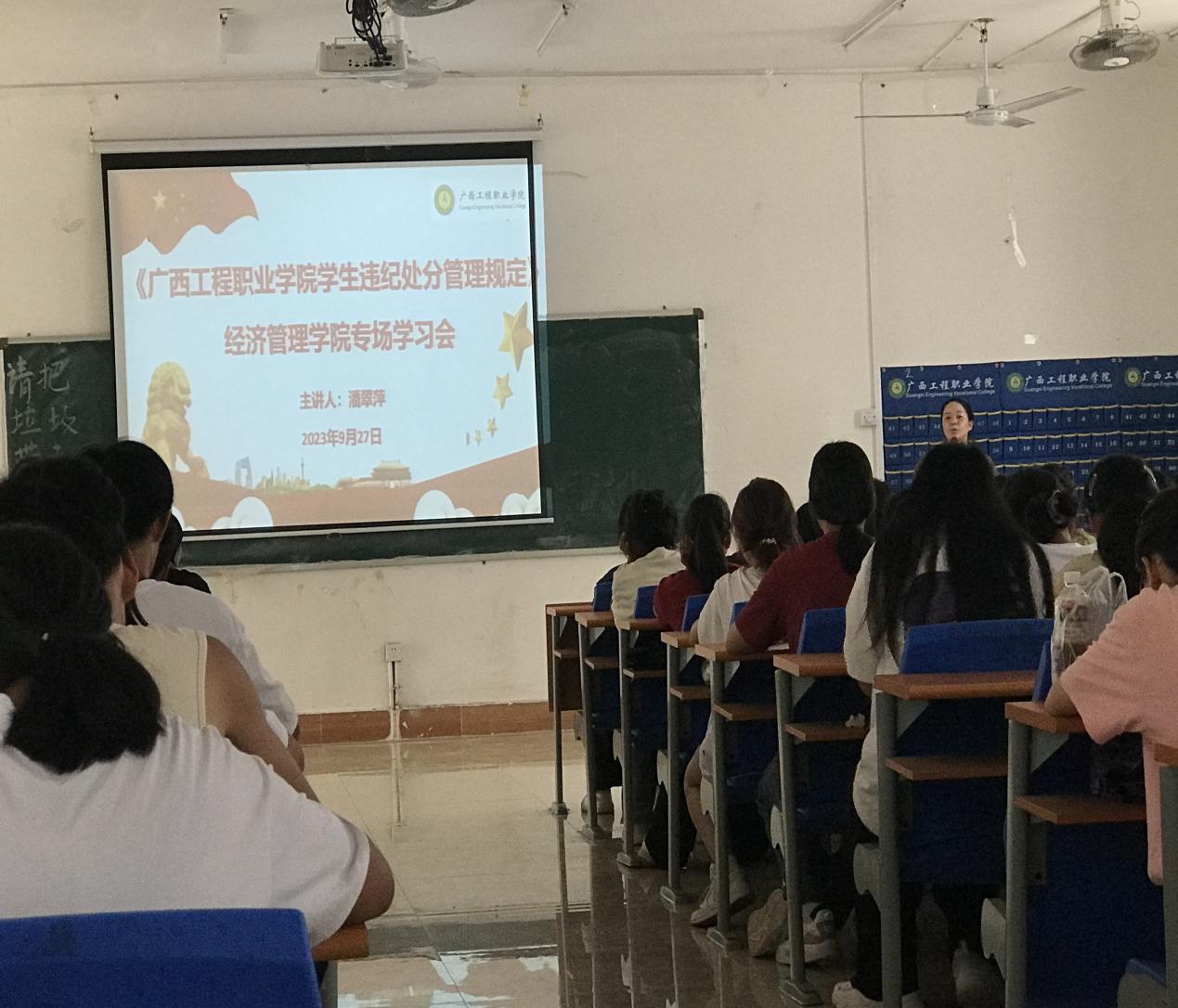 為全面貫徹黨的教育方針,維護(hù)學(xué)校正常的教學(xué)、生活秩序,從嚴(yán)治校,促進(jìn)學(xué)生成為有理想、有道德、有文化、有紀(jì)律的社會主義事業(yè)接班人。同時也讓2023級新生能快速了解學(xué)校管理規(guī)定,知曉學(xué)校管理紅線和底線。根據(jù)學(xué)校入學(xué)教育課程計(jì)劃,結(jié)合學(xué)院實(shí)際,學(xué)院于2023年9月27日下午在經(jīng)濟(jì)管理學(xué)院102教室開展主題為《廣西工程職業(yè)學(xué)院學(xué)生違紀(jì)處分管理規(guī)定》的專題培訓(xùn)。本次培訓(xùn)由經(jīng)濟(jì)管理學(xué)院黨支部副書記潘翠萍老師做專題培訓(xùn)。