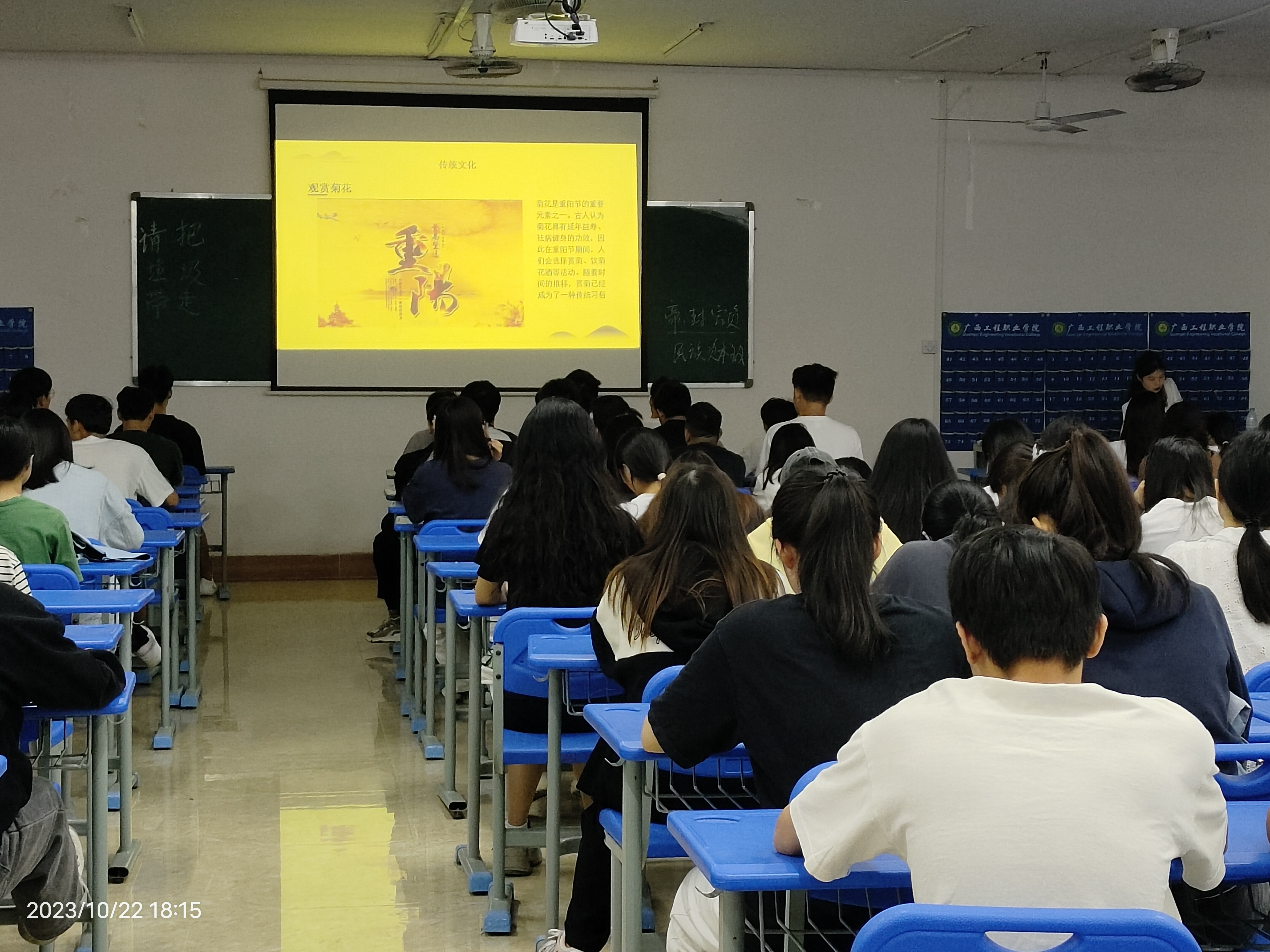 班會課上,老師通過ppt和視頻的形式給學(xué)生們講述了重陽節(jié)的由來、傳統(tǒng)習(xí)俗和意義,播放了有關(guān)重陽節(jié)傳說的短視頻,讓學(xué)生更加了解重陽節(jié)歷史。不僅如此,班級的活動形式也多種多樣。各個班級通過優(yōu)美的詩歌朗誦、感人的故事和生動的事例的演講,不但使同學(xué)們知道了重陽節(jié)的由來,還懂得了尊老愛老是我們中華民族的優(yōu)良傳統(tǒng),從而告誡每位同學(xué)都要尊敬老人。