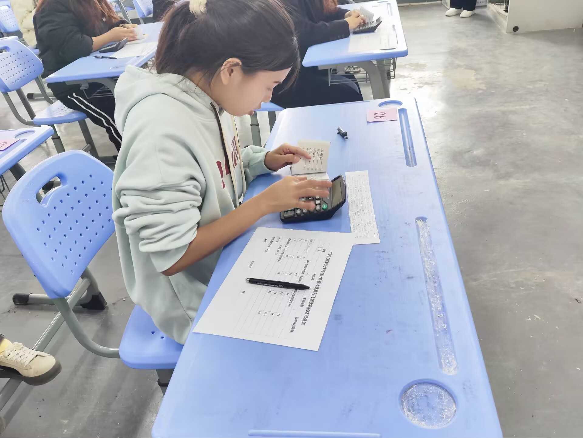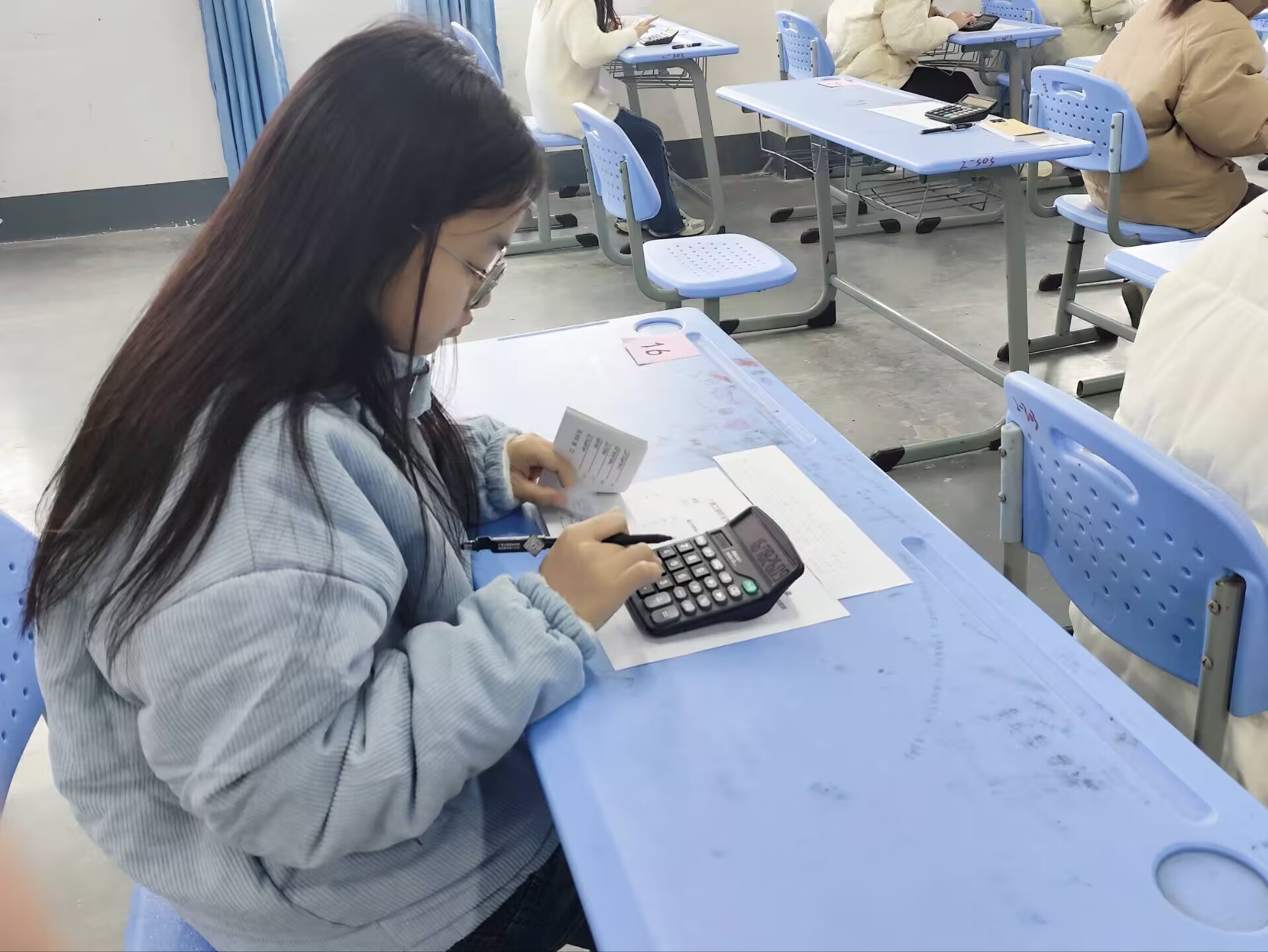 翻打傳票項目中,隨著老師“開始”一聲令下,選手們迅速進入比賽狀態(tài),每位選手都全神貫注地投入比賽當中,目光在傳票和計算器上的數(shù)字之間來回掃視,左手嫻熟地翻動著傳票,右手快速地敲擊著鍵盤上的按鍵,手指快捷、輕靈地游走在各個數(shù)字和符號之間,沒有片刻中斷。比賽現(xiàn)場呈現(xiàn)出職業(yè)競技中專業(yè)而緊張的氛圍。敏捷的反應(yīng)與熟練的指法,展現(xiàn)出財會學子對職業(yè)技能日益駕輕就熟、嚴謹認真的職業(yè)態(tài)度。
