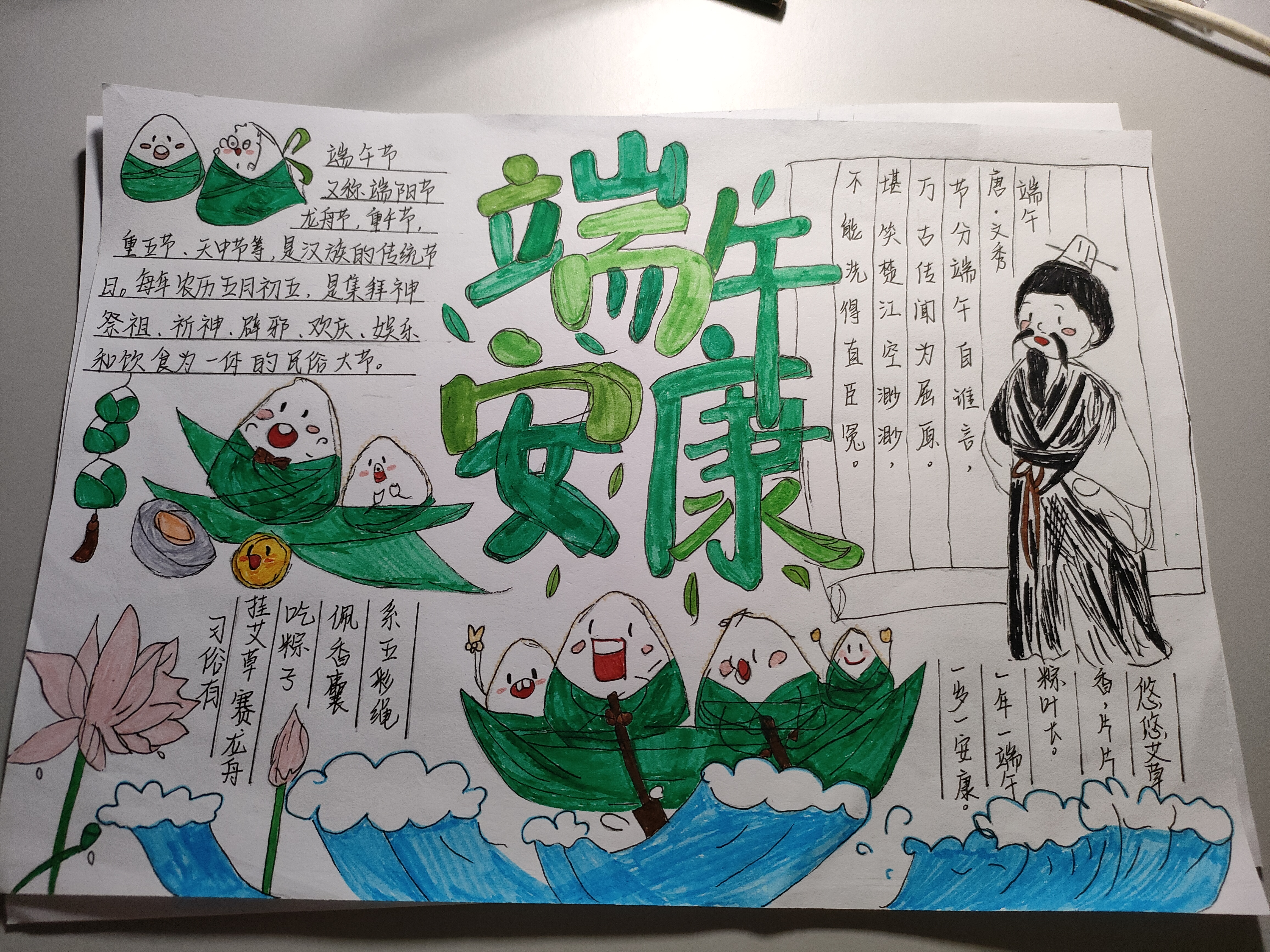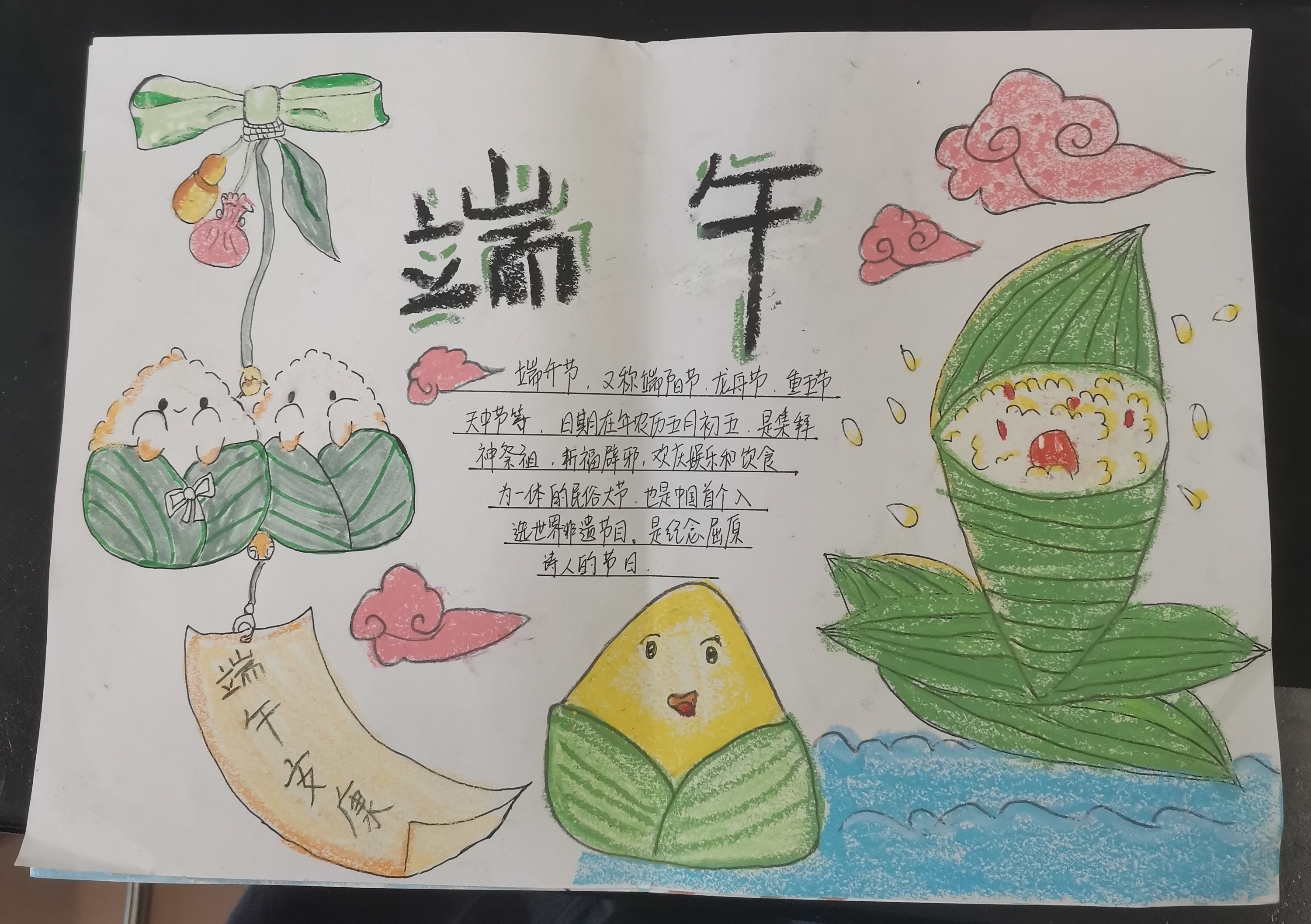為更好的了解和感受端午節(jié)的文化內(nèi)涵,通過描繪“端午節(jié)”主題手抄報的形式,增強(qiáng)同學(xué)們對中華文化的自信意識,促使更多同學(xué)們參與傳統(tǒng)文化的傳承和弘揚(yáng)。同時,使同學(xué)們充分發(fā)揮自己的想象力,繪制了一幅幅生動逼真、活靈活現(xiàn)的作品。并講解自己對端午節(jié)的認(rèn)識及繪畫的靈感與感觸,讓大家深刻理解到的端午節(jié)背后的歷史故事和民族精神,激發(fā)了同學(xué)們的愛國主義情感,增強(qiáng)民族自豪感和愛國主義情操。
