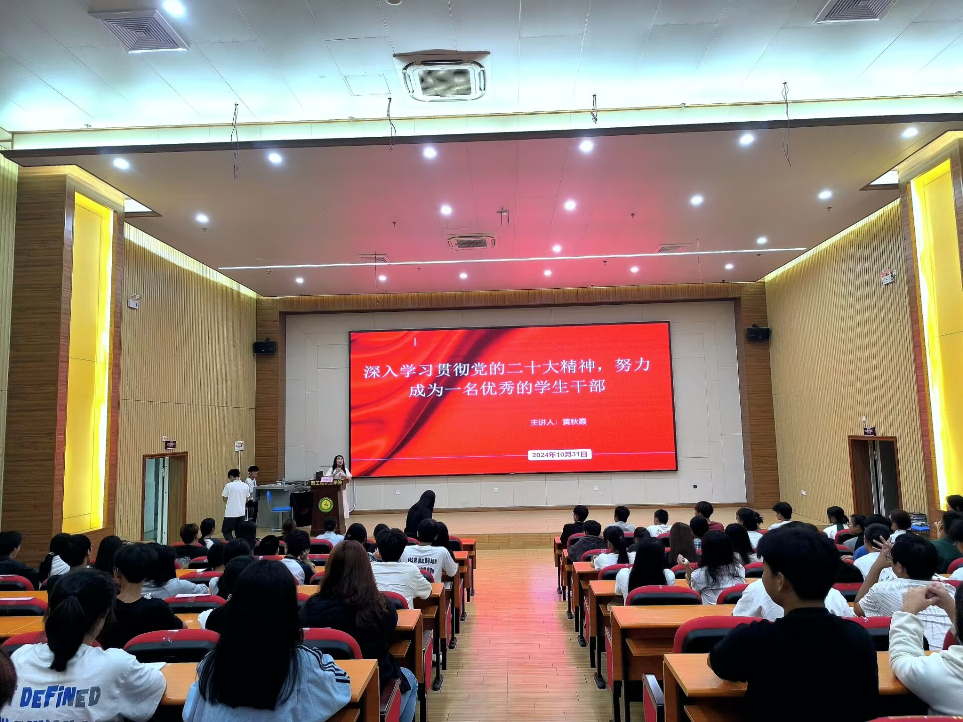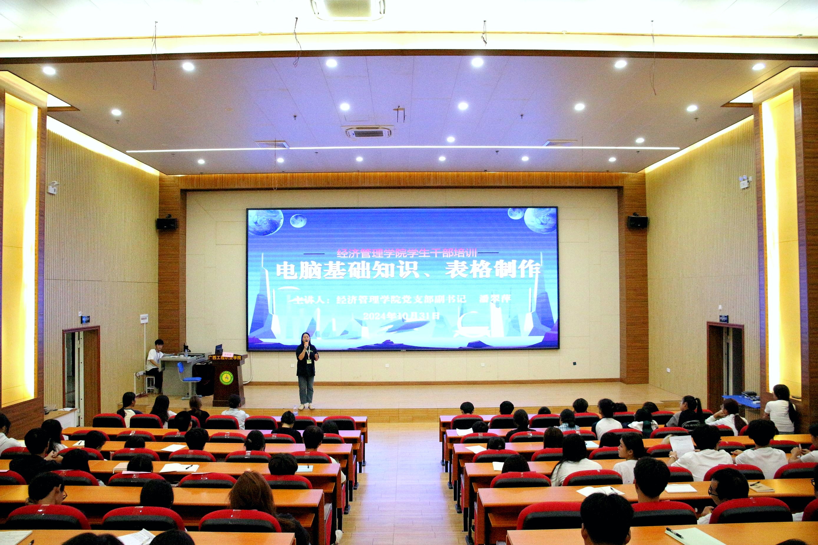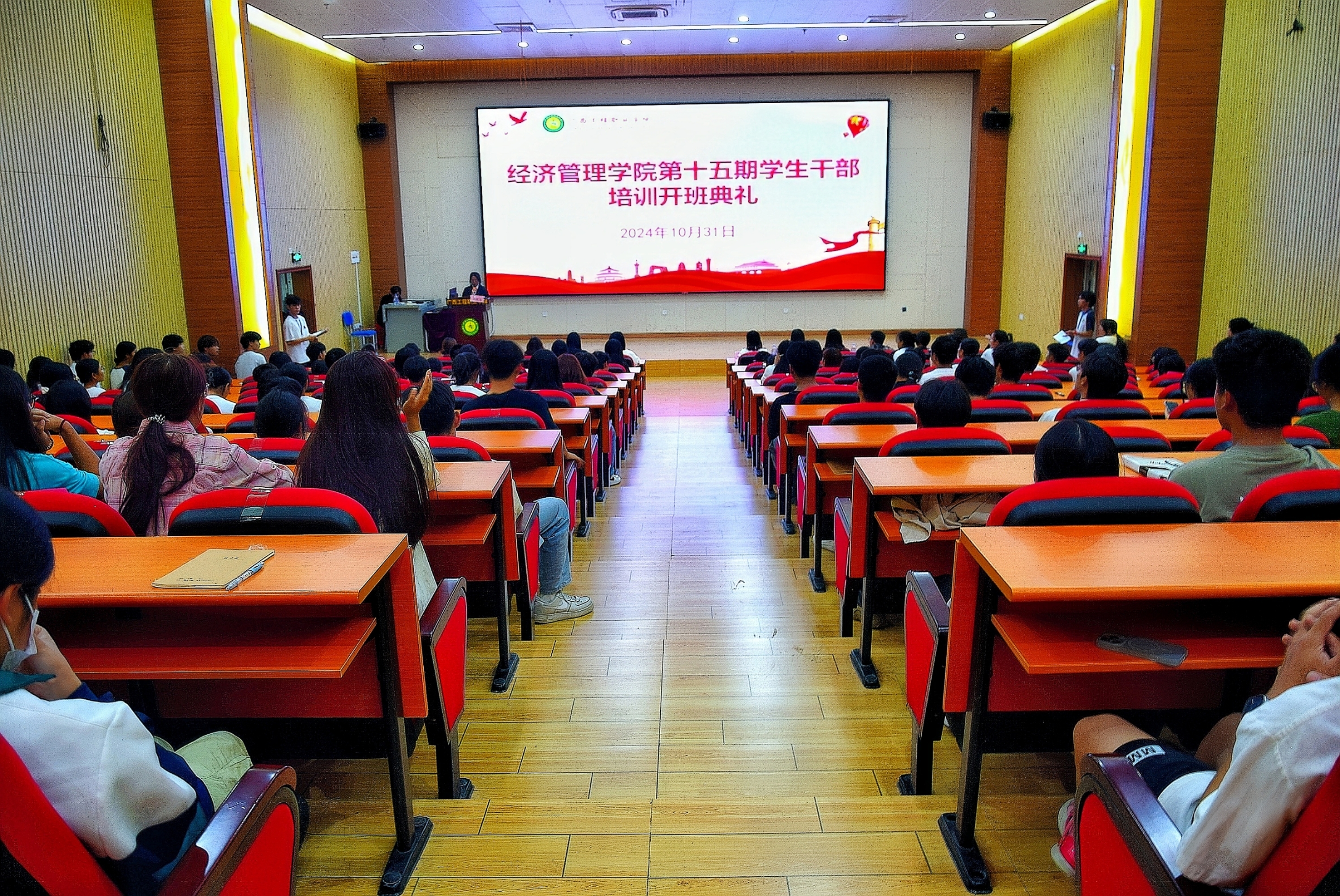 10月31日晚19:00,培訓(xùn)班開班典禮在圖文信息大樓一樓學(xué)術(shù)報(bào)告廳舉行,黨委副書記黃秋霞,經(jīng)濟(jì)管理學(xué)院院長(zhǎng)、黨支部書記覃清香,黨支部副書記潘翠萍,經(jīng)濟(jì)管理學(xué)院分團(tuán)委書記李東英出席培訓(xùn)班開班典禮,經(jīng)濟(jì)管理學(xué)院全體輔導(dǎo)員參加開班典禮,參訓(xùn)學(xué)員為學(xué)院各班級(jí)班干部、2024級(jí)學(xué)生會(huì)全體干事。