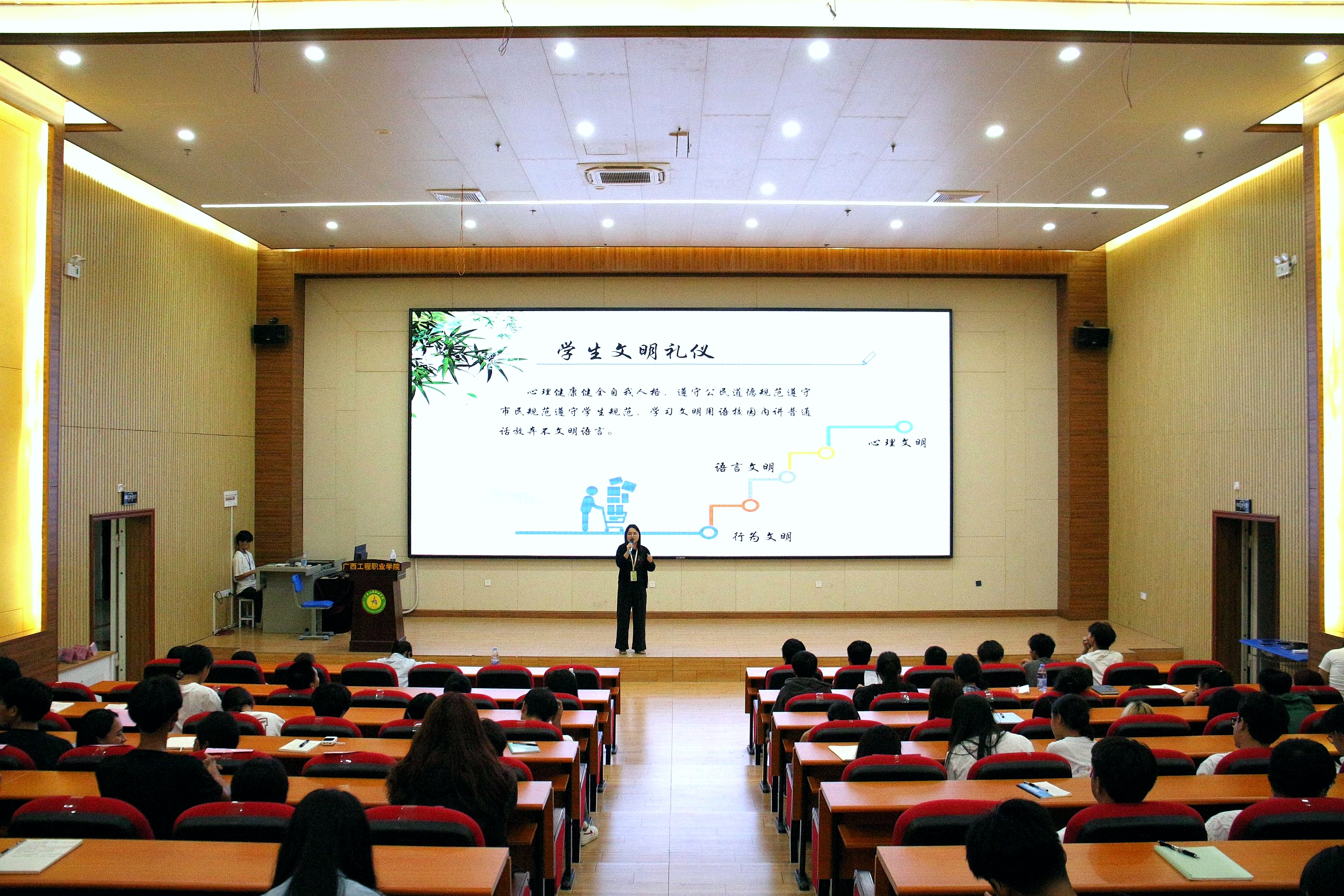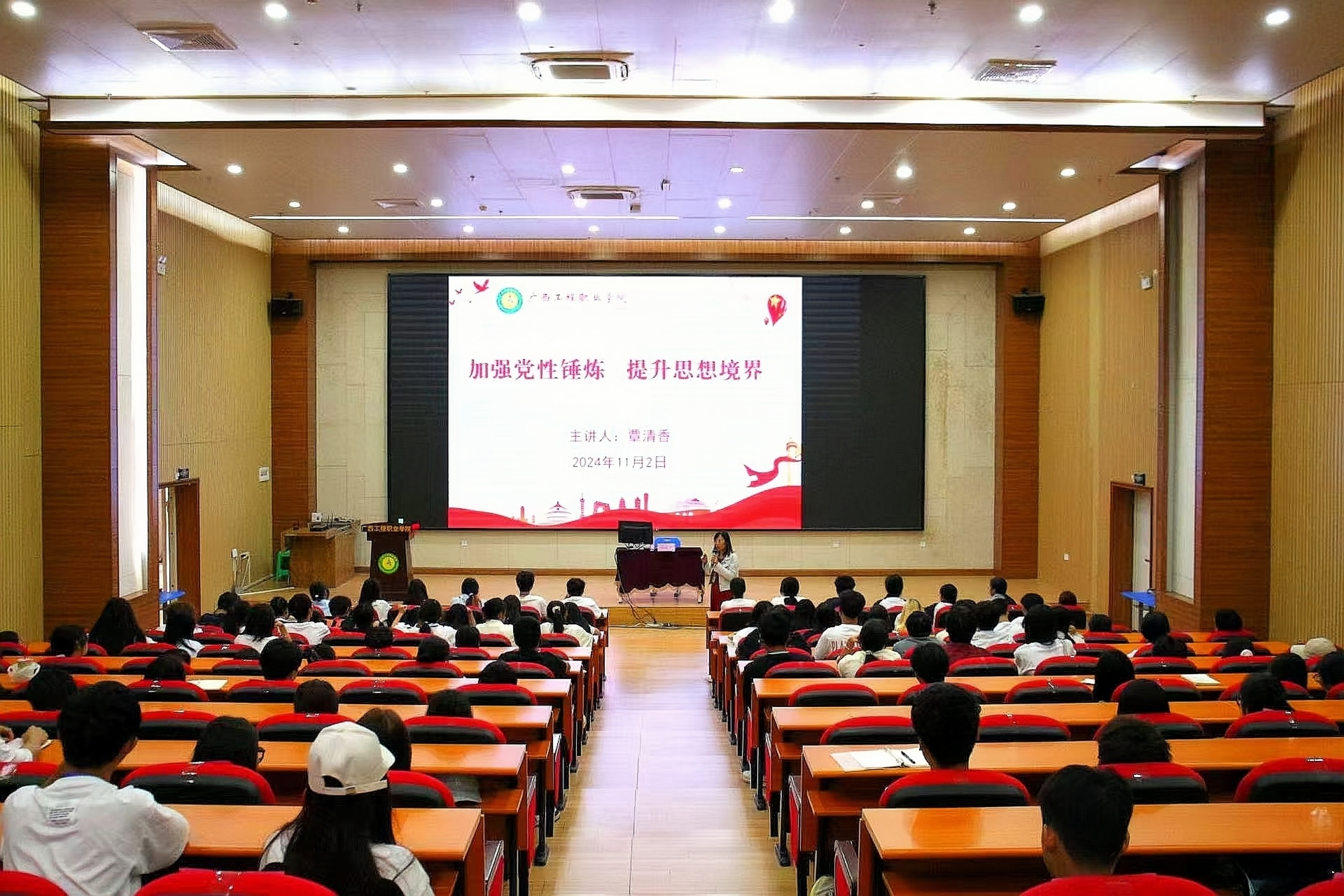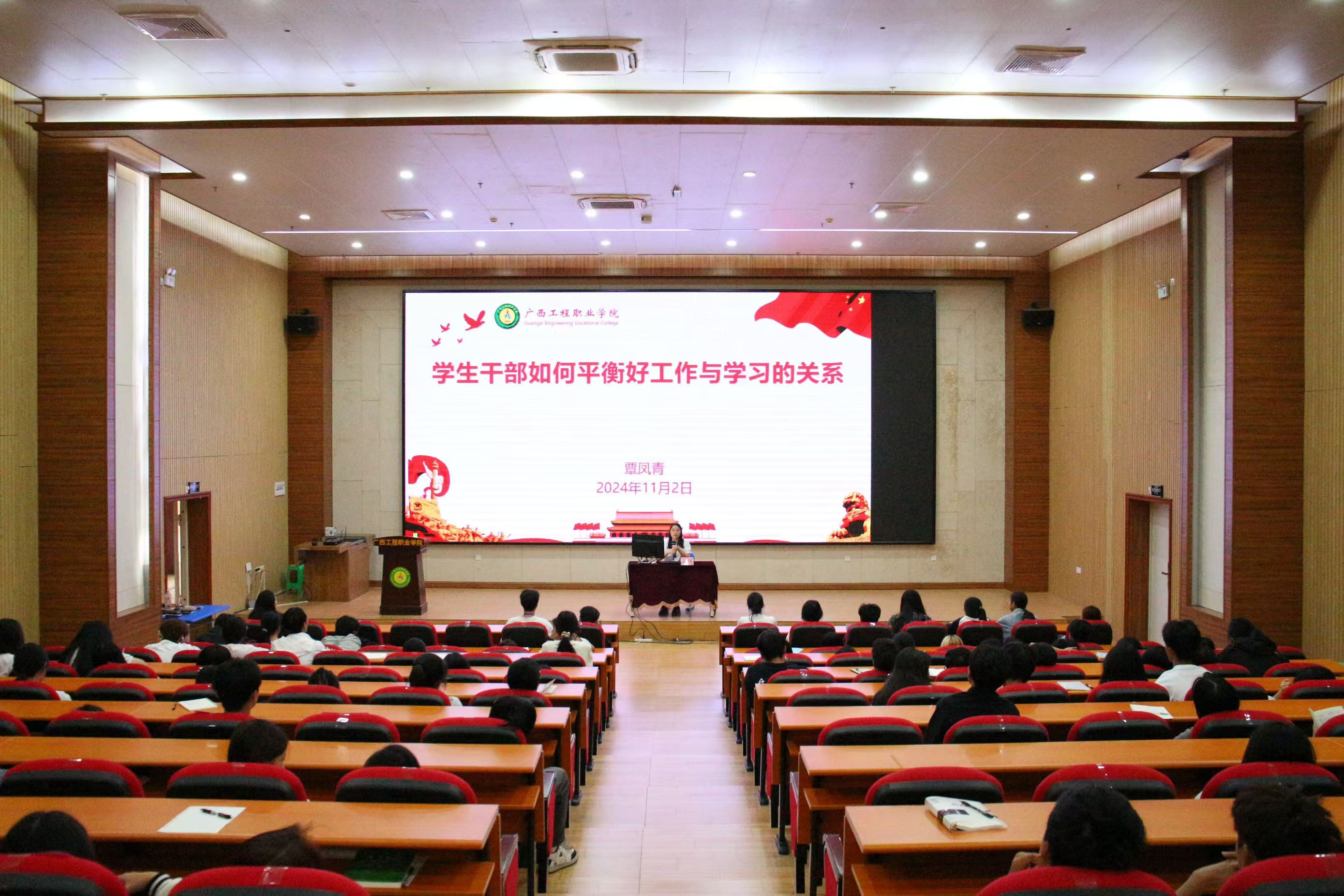 10月31日晚19:00,培訓(xùn)班開班典禮在圖文信息大樓一樓學(xué)術(shù)報(bào)告廳舉行,黨委副書記黃秋霞,經(jīng)濟(jì)管理學(xué)院院長(zhǎng)、黨支部書記覃清香,黨支部副書記潘翠萍,經(jīng)濟(jì)管理學(xué)院分團(tuán)委書記李東英出席培訓(xùn)班開班典禮,經(jīng)濟(jì)管理學(xué)院全體輔導(dǎo)員參加開班典禮,參訓(xùn)學(xué)員為學(xué)院各班級(jí)班干部、2024級(jí)學(xué)生會(huì)全體干事。