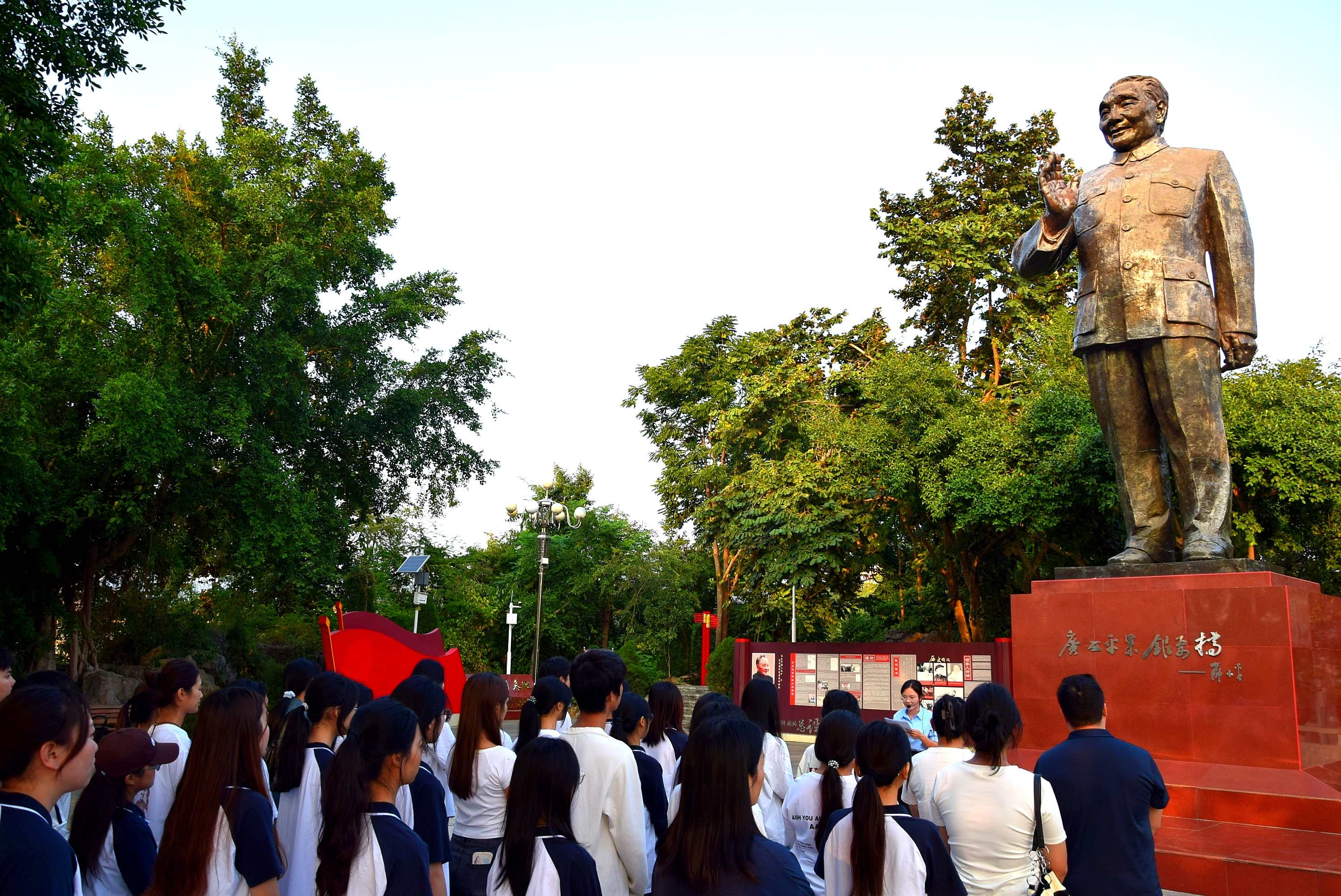 在鄧小平銅像前,馬克思主義學(xué)院思想政治課教師梁翠霞做專題授課,她主要介紹鄧小平同志簡介、成長經(jīng)歷、參加革命的歷程,并重點講述鄧小平等同志在領(lǐng)導(dǎo)發(fā)動百色起義和創(chuàng)建右江革命根據(jù)地的事跡,以及他在右江地區(qū)、平果縣的生活經(jīng)歷。新中國成立后,在黨的十一屆三中全會召開以后,做出了一系列改變中國命運的關(guān)鍵抉擇。特別是在1986年鄧小平說:“廣西平果鋁要搞”,這句話推動了廣西百色“鋁工業(yè)革命”的蓬勃發(fā)展,才有了我們平果市今天的天翻地覆的滄桑巨變,由過去的“國定貧困縣”發(fā)展為“全國百強(qiáng)縣”,到現(xiàn)在成為縣級市。現(xiàn)在我們看到的鄧小平同志銅像,是為了紀(jì)念他,緬懷他對平果市的發(fā)展作出的卓越貢獻(xiàn)。在這里,我們可以感受到他的崇高理想以及精神品質(zhì)。