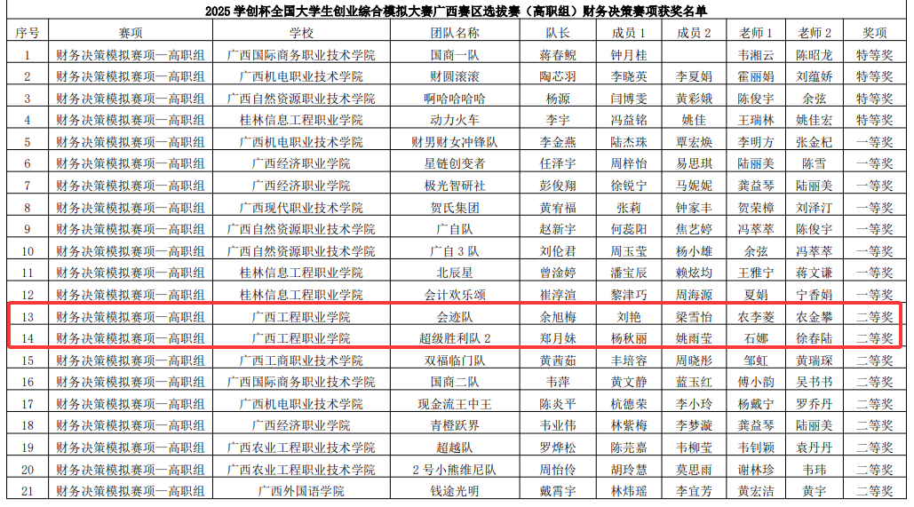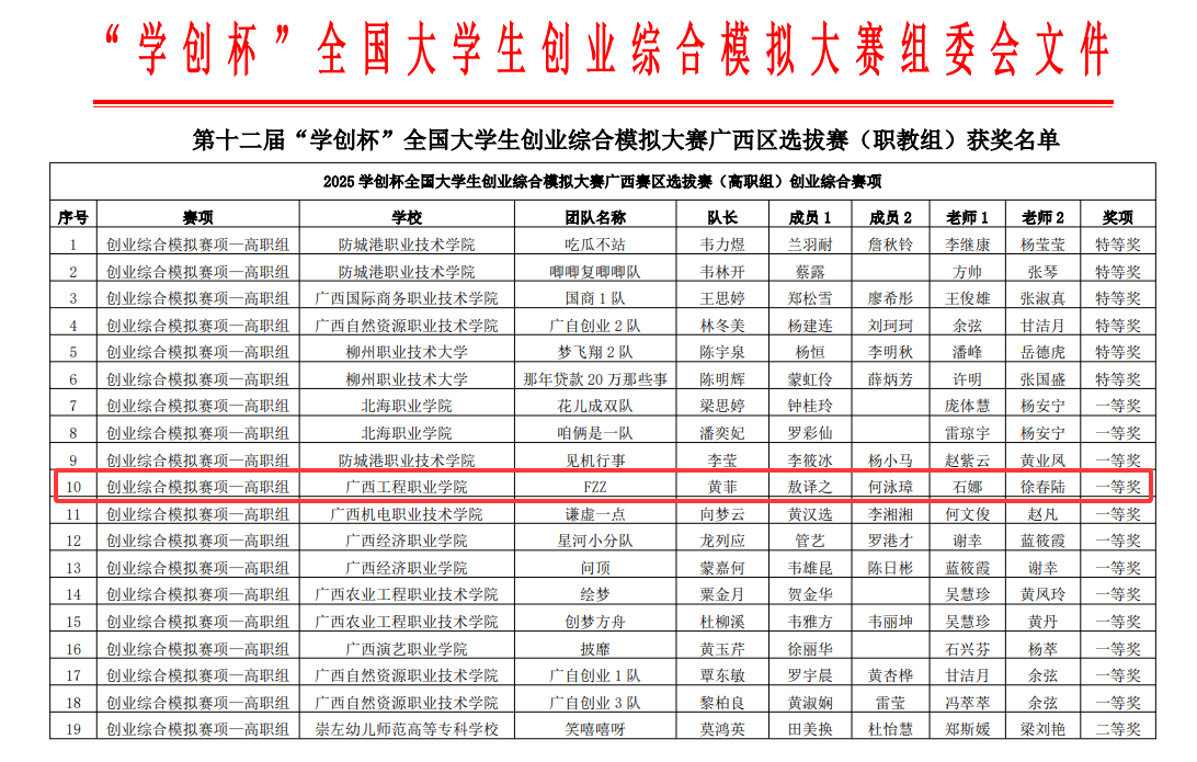 6月27日—28日,2025年第十二屆“學(xué)創(chuàng)杯”全國大學(xué)生創(chuàng)業(yè)綜合模擬大賽廣西賽區(qū)選拔賽(職教組)在柳州職業(yè)技術(shù)大學(xué)舉行,本次選拔賽共有32所高校、500余師生參與競賽。廣西工程職業(yè)學(xué)院經(jīng)濟(jì)管理學(xué)院石娜和徐春陸,鐵道與航空學(xué)院徐琳和韋丹蕾共4位老師帶領(lǐng)2023級大數(shù)據(jù)與會計(jì)專業(yè)黃菲、2023級電子商務(wù)專業(yè)鄭誠、2023級城市軌道交通工程技術(shù)專業(yè)方益元、2023級學(xué)前教育專業(yè)許婉婷等26名同學(xué)參加此次比賽,通過不懈努力,榮獲
