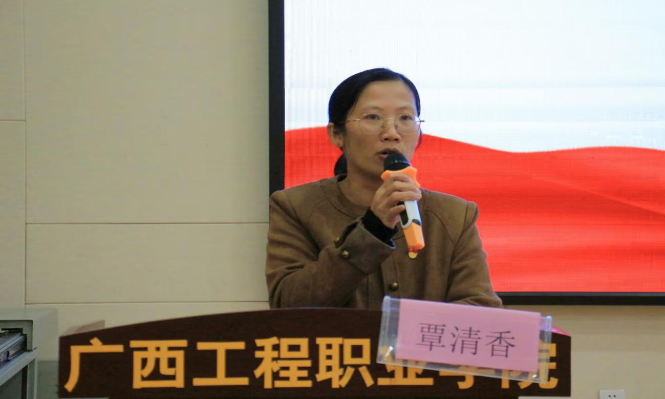 圖為經(jīng)濟(jì)管理學(xué)院黨支部書記、院長覃清香作《強(qiáng)化思想淬煉,感悟思想偉力,做新時代青春領(lǐng)航人》主題培訓(xùn)