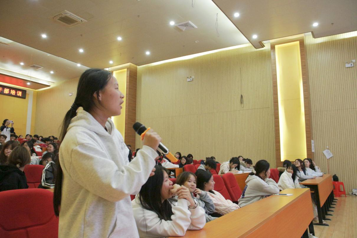 圖為學(xué)校黨委副書記黃秋霞作《傳承紅色基因·挺膺青春使命—新時代學(xué)生干部的思政引領(lǐng)與實干擔(dān)當(dāng)》主題培訓(xùn)