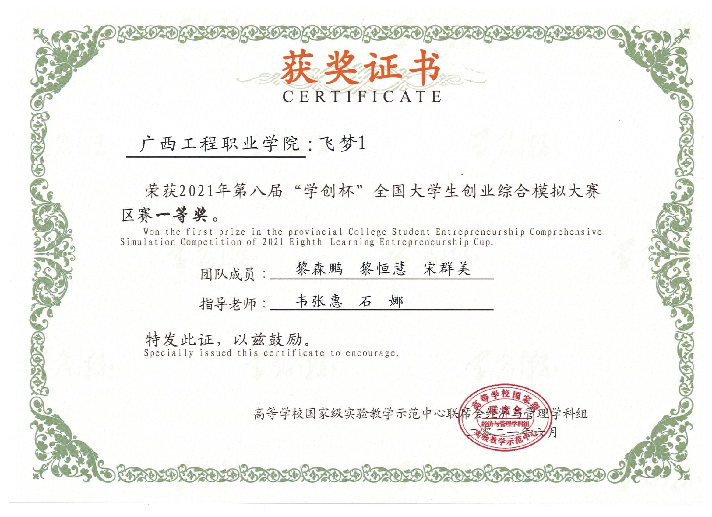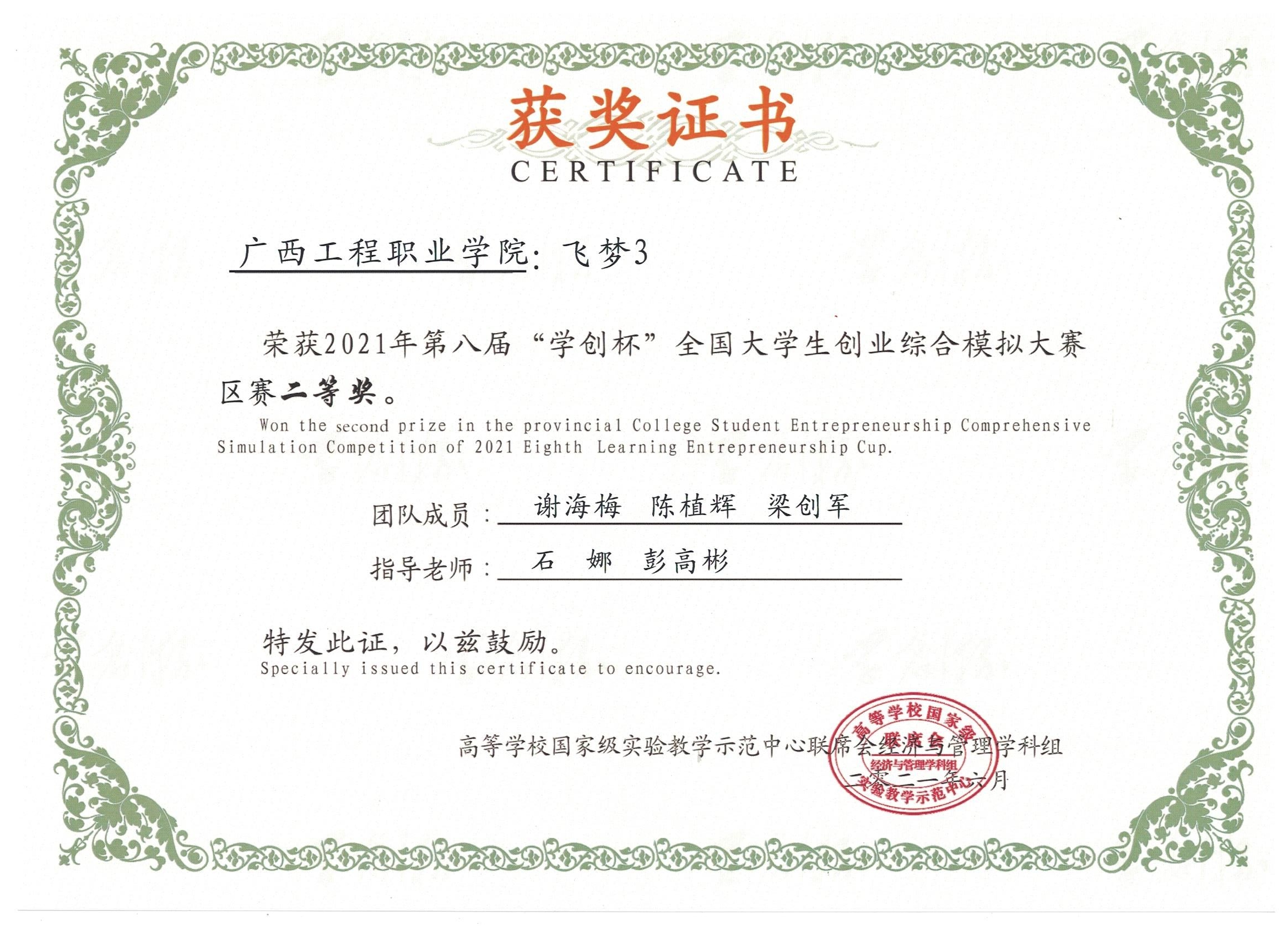 2021年6月5日,2021年第八屆“學(xué)創(chuàng)杯”全國大學(xué)生創(chuàng)新創(chuàng)業(yè)綜合模擬大賽廣西壯族自治區(qū)選拔賽在柳州職業(yè)技術(shù)學(xué)院舉行,來自全區(qū)30余所高校的76支隊伍、200多名選手參加了比賽,比賽分本科和高職兩組進行,我院學(xué)生代表學(xué)校參加比賽,3組參賽團隊榮獲高職組一等獎兩項、二等獎一項。