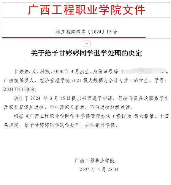 根據(jù)《普通高等學(xué)校學(xué)生管理規(guī)定》(教育部令第41號(hào))、《廣西工程職業(yè)學(xué)院學(xué)生學(xué)籍管理辦法(修訂)》第二十四條規(guī)定,給予甘婷婷同學(xué)退學(xué)處理,并注銷其學(xué)籍。