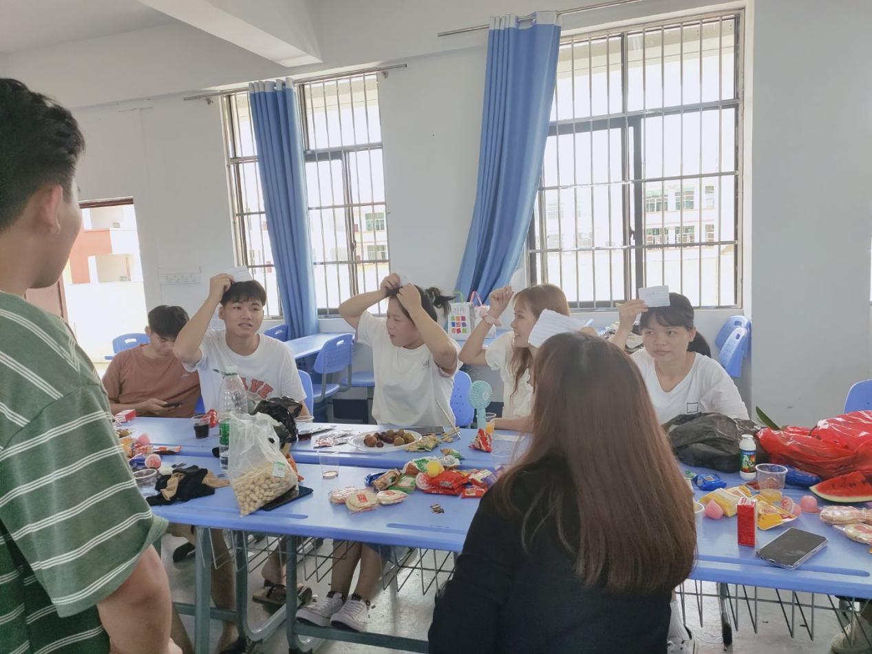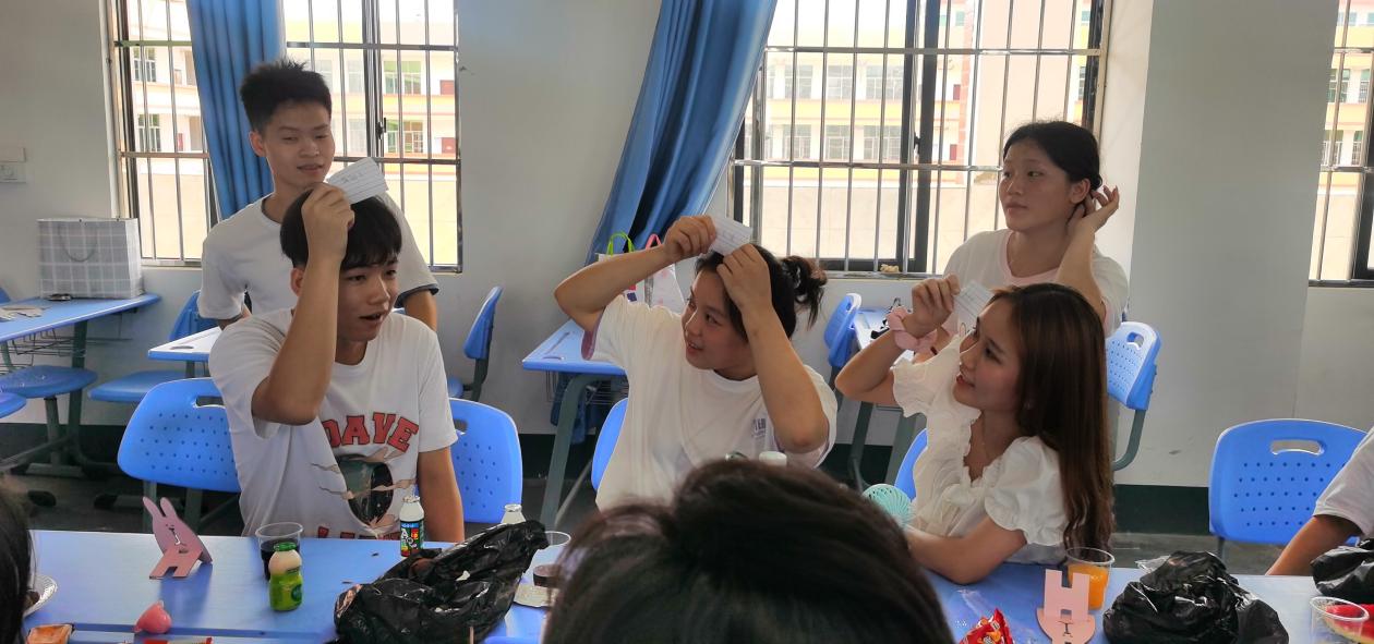 學(xué)生參加“害”你在心口難開游戲(在每個(gè)人的布帶上都有一張精心準(zhǔn)備好的卡片,卡片上寫著被貼紙的人不能做的事或者不能說的話(也有陷阱卡),一旦被貼紙的人做出紙片上的事,就是中招了,要接受懲罰。)