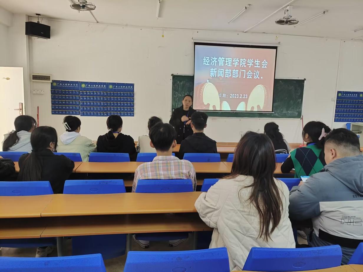 為了更好的提升學(xué)生會新聞部的寫作能力及宣傳水平,2023年2月23日在經(jīng)濟管理學(xué)院教學(xué)樓102室召開部門會議。參會人員有經(jīng)濟管理學(xué)院院長龐英連、學(xué)生科科長李東英、辦公室主任雷紅以及新聞部的干部和干事。