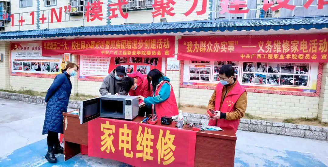 為學(xué)習(xí)貫徹黨的二十大精神,推動(dòng)黨支部“我為群眾辦實(shí)事”活動(dòng)走深走實(shí),汽車與機(jī)電學(xué)院黨支部在學(xué)校黨委的組織下,2022年12月2日參加平果市大學(xué)園區(qū)與馬頭鎮(zhèn)城東社區(qū)聯(lián)盟“大黨委”開展的“學(xué)思踐悟二十大 校社同心跟黨走”暨民族團(tuán)結(jié)進(jìn)步創(chuàng)建活動(dòng),到馬頭鎮(zhèn)城東社區(qū)為居民提供免費(fèi)家電維修志愿服務(wù)活動(dòng)。