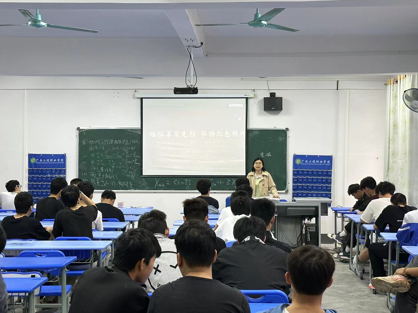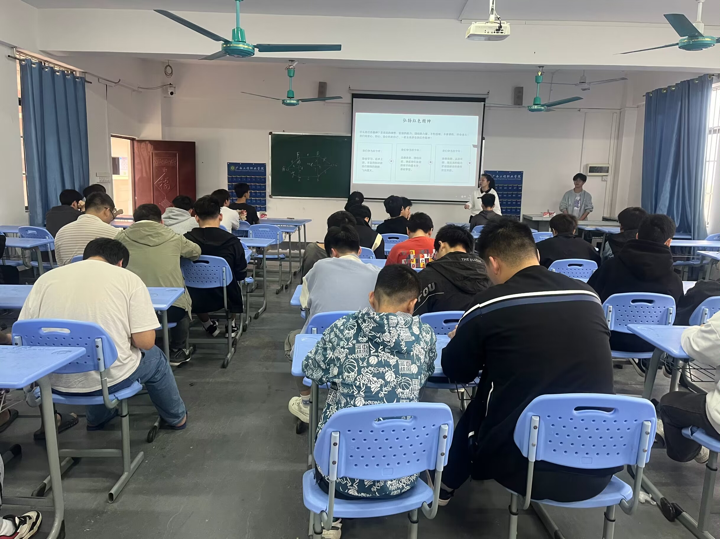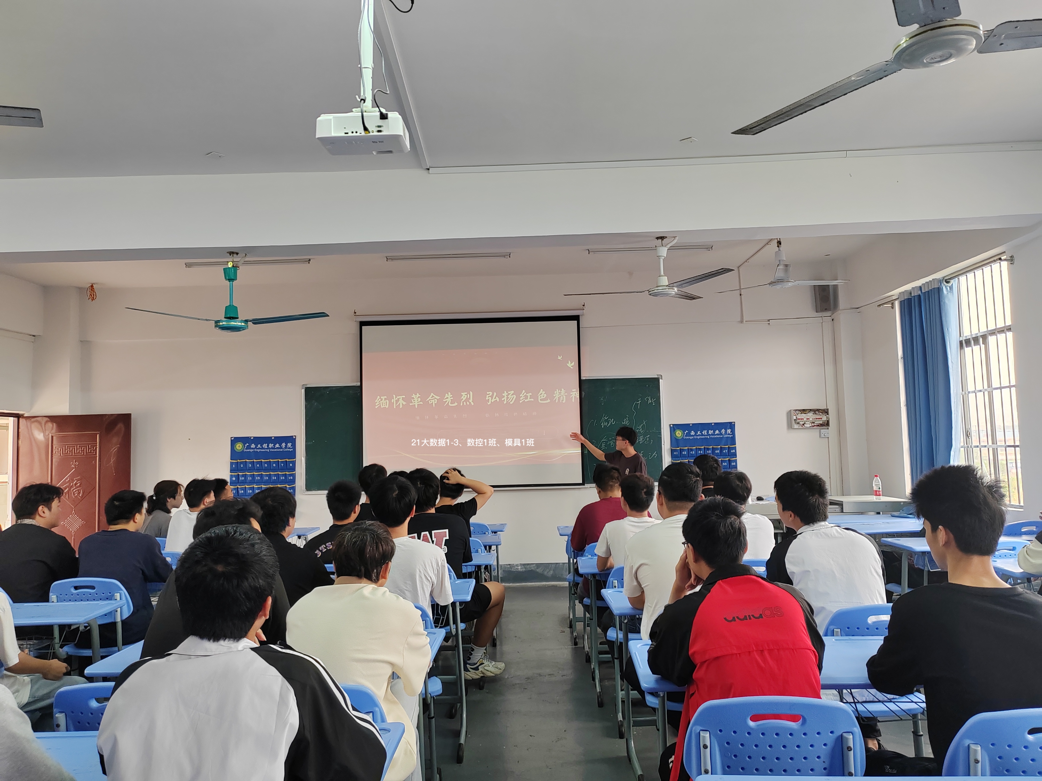 王小明老師在班會上講述先烈們?yōu)榱俗鎳I出青春與熱血的典型感人事故事