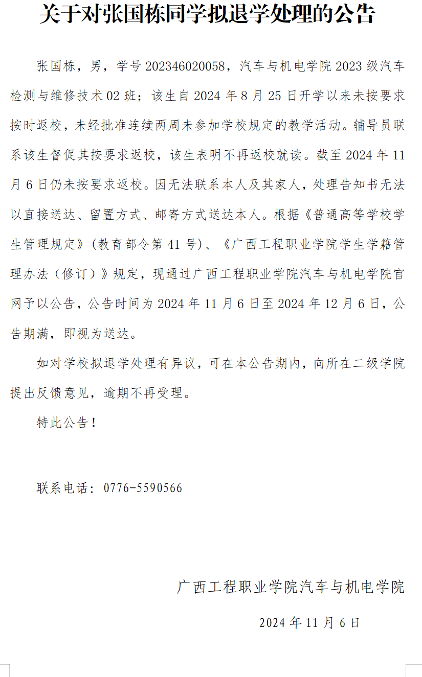 張國棟,男,學號202346020058,汽車與機電學院2023級汽車檢測與維修技術02班;該生自2024年8月25日開學以來未按要求按時返校,未經(jīng)批準連續(xù)兩周未參加學校規(guī)定的教學活動。輔導員聯(lián)系該生督促其按要求返校,該生表明不再返校就讀。截至2024年11月6日仍未按要求返校。因無法聯(lián)系本人及其家人,處理告知書無法以直接送達、留置方式、郵寄方式送達本人。根據(jù)《普通高等學校學生管理規(guī)定》(教育部令第41號)、《廣西工程職業(yè)學院學生學籍管理辦法(修訂)》規(guī)定,現(xiàn)通過廣西工程職業(yè)學院汽車與機電學院官網(wǎng)予以公告,公告時間為2024年11月6日至2024年12月6日,公告期滿,即視為送達。