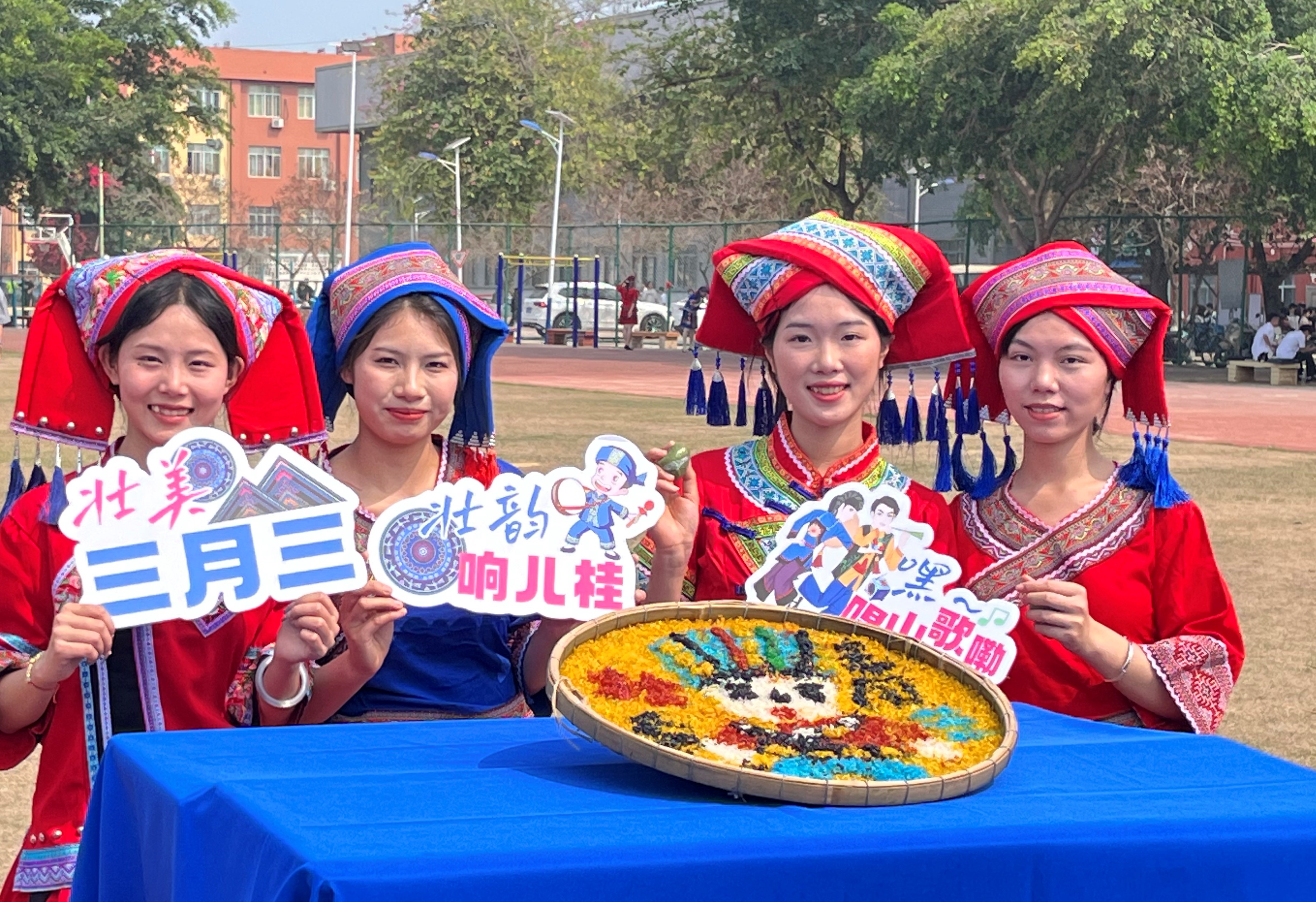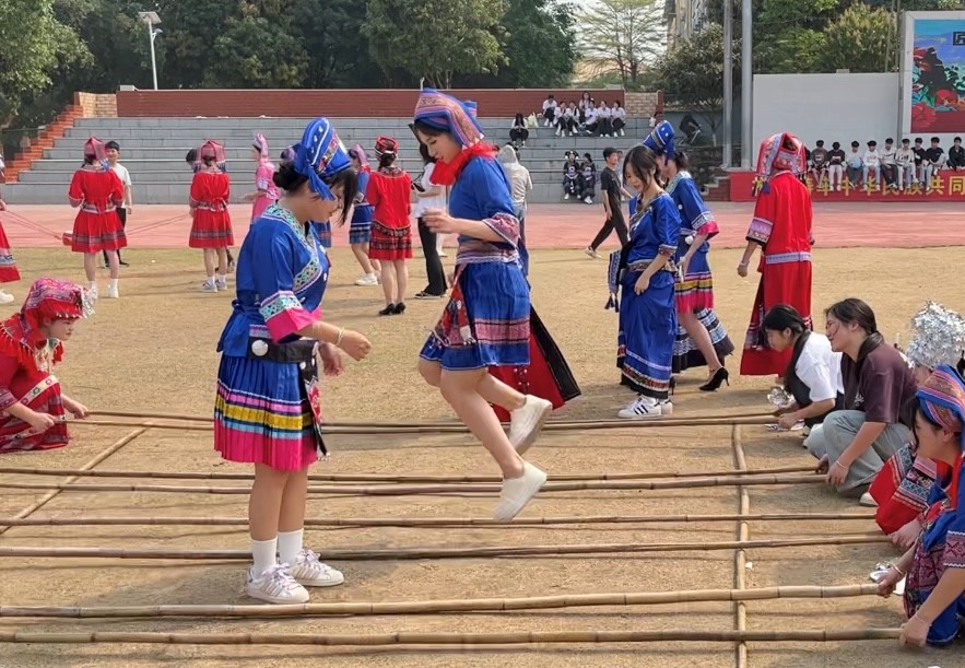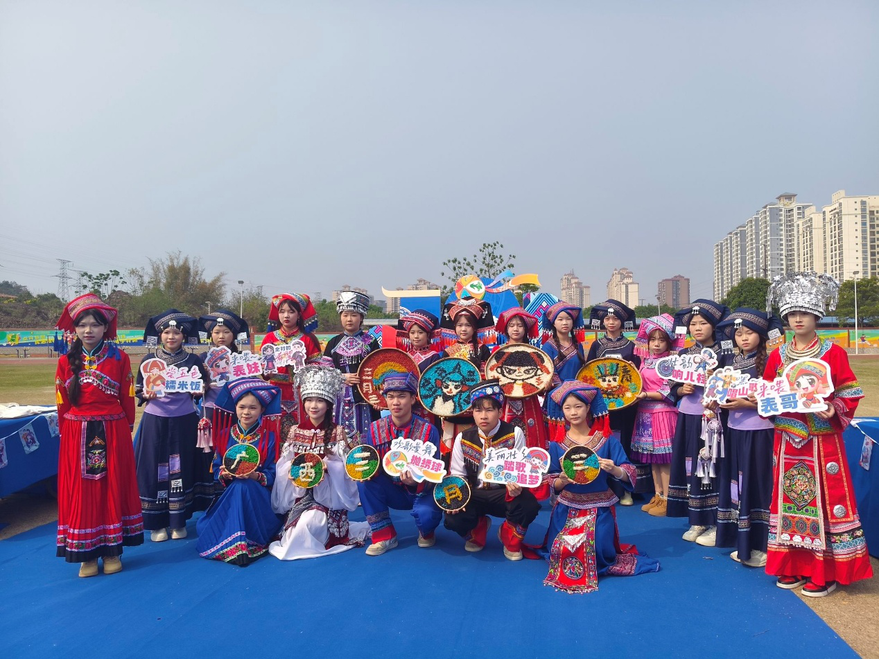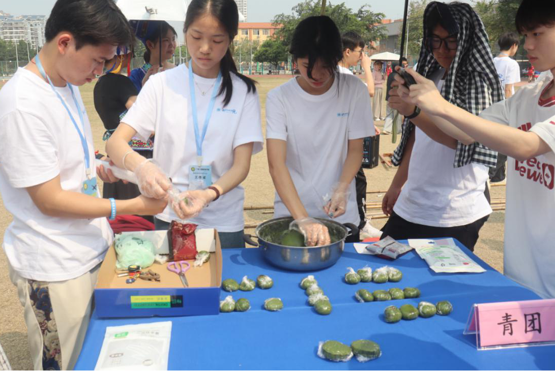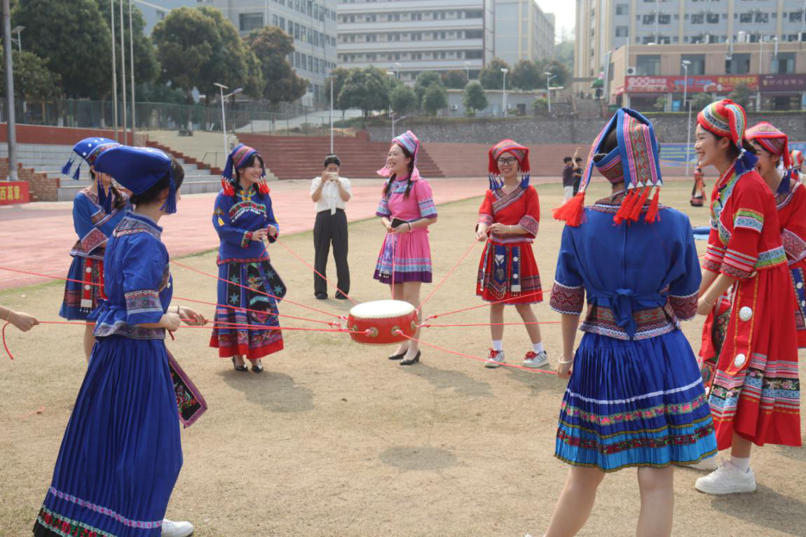 其中在民族手工藝展示區(qū),師生親手制作壯鄉(xiāng)手工銅鼓、編織民族飾品,感受工藝術(shù)的樂趣;在民族美食區(qū),大家一起動手制作并品嘗到地道的壯族美食,如五色糯米飯、青團(tuán)等,讓味蕾也沉浸在民族文化的海洋中;在民族體育競技區(qū),師生共同參與同心擊鼓、拋繡球等傳統(tǒng)體育項目,感受民族體育的激情與活力。