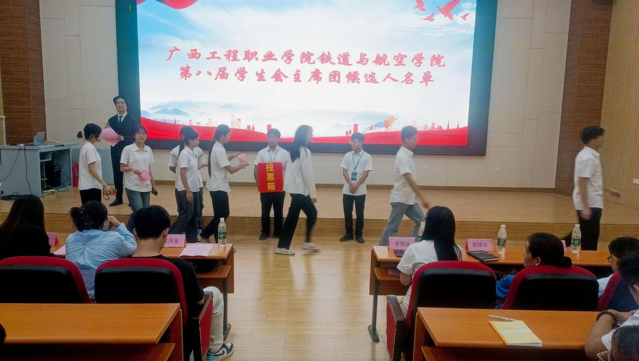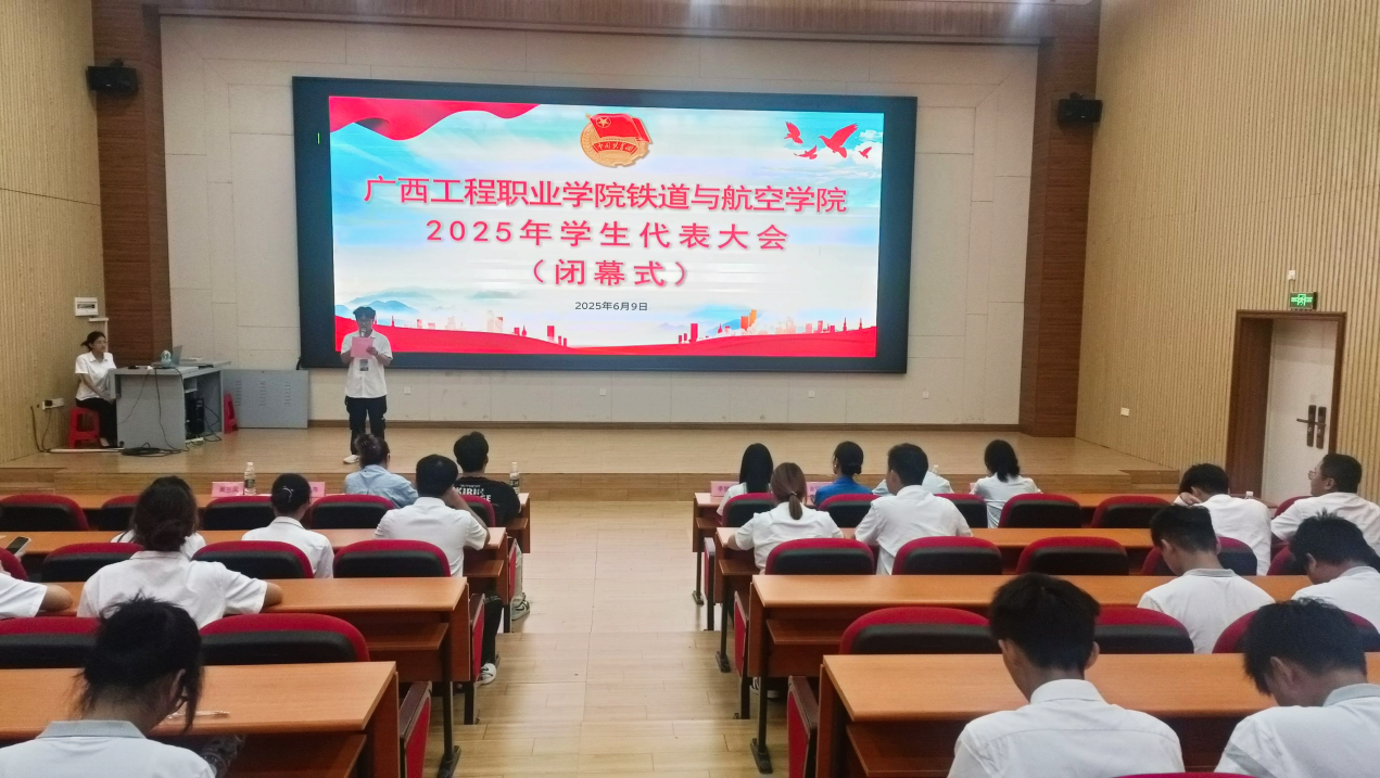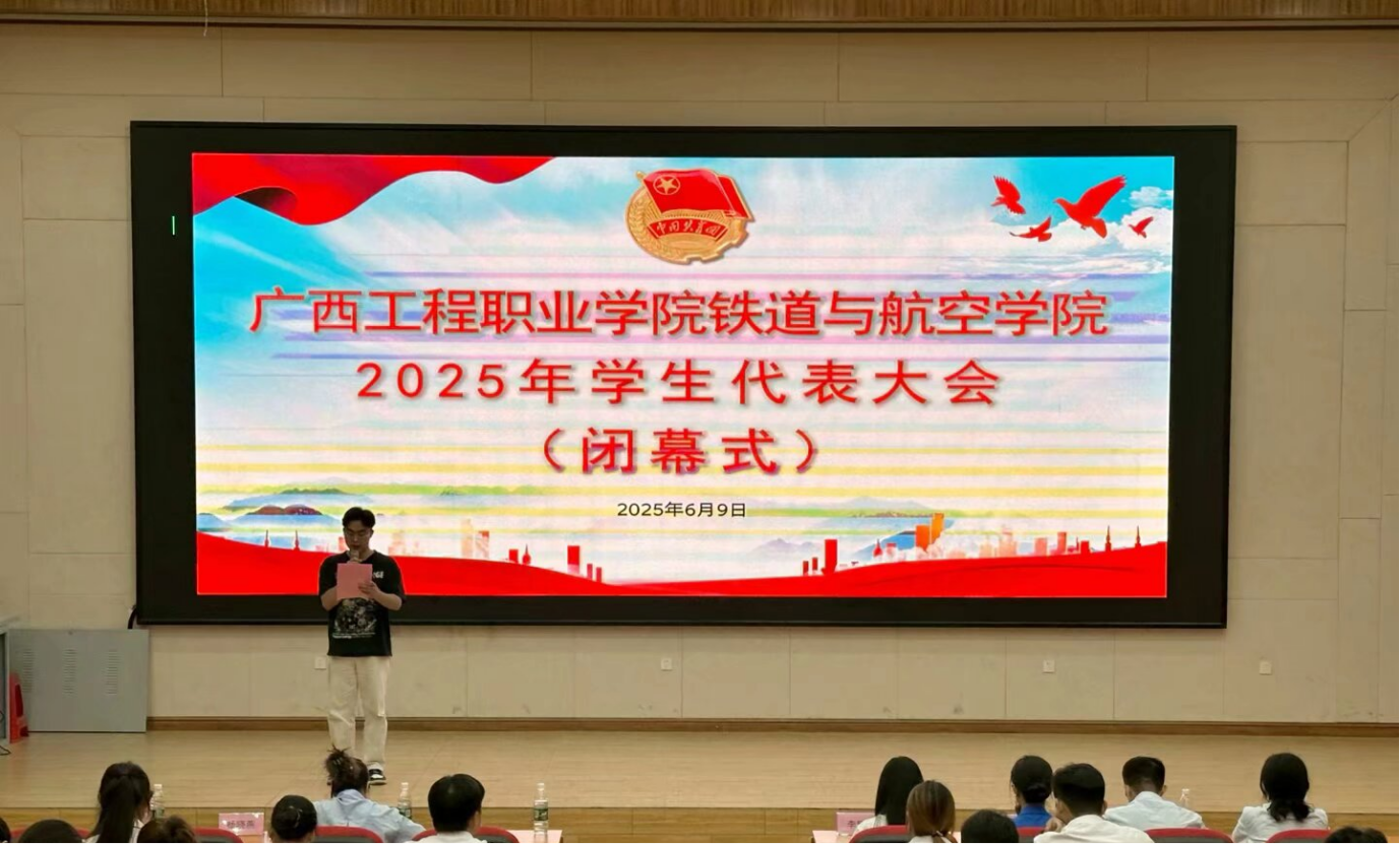 主持人章昊宣讀廣西工程職業(yè)學(xué)院鐵道與航空學(xué)院2025年學(xué)生代表大會(huì)總監(jiān)票人、監(jiān)票人、總計(jì)票人、計(jì)票人名單