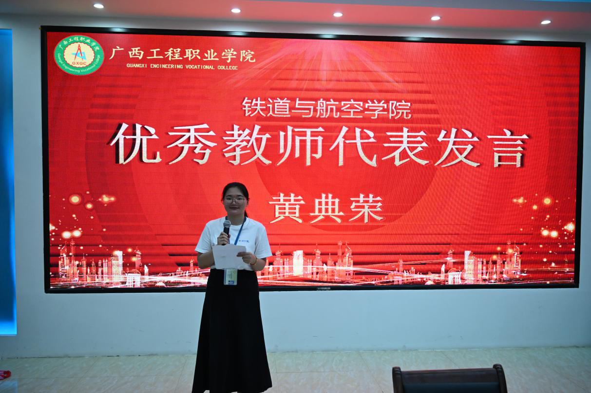 緊接著,優(yōu)秀教師代表黃典榮發(fā)言,她對學校的精心栽培表示衷心的感謝,并如何激發(fā)學生的主動性與創(chuàng)造力以及如何引導學生樹立正確的價值觀和職業(yè)觀兩方面分享了自己的優(yōu)秀教學方法,力求與各位同仁攜手并進,為培養(yǎng)更多高素質(zhì)技術技能人才貢獻自己的力量。