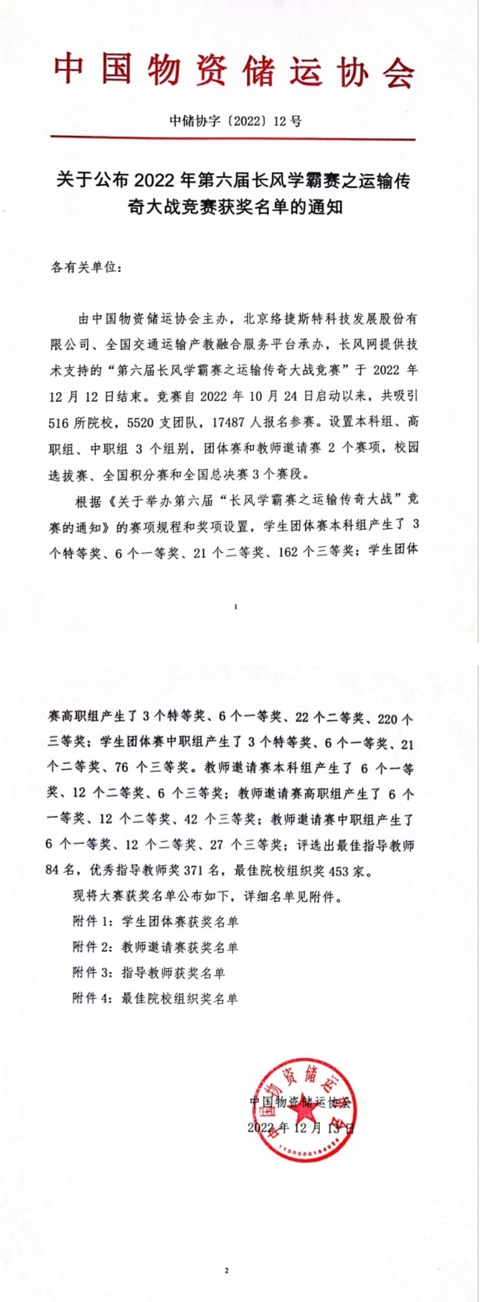 由中國(guó)物資儲(chǔ)運(yùn)協(xié)會(huì)主辦,全國(guó)交通運(yùn)輸產(chǎn)教融合服務(wù)平臺(tái)承辦,長(zhǎng)風(fēng)網(wǎng)提供技術(shù)支持的“第六屆長(zhǎng)風(fēng)學(xué)霸賽之運(yùn)輸傳奇大戰(zhàn)競(jìng)賽”于2022年12月12日落下帷幕,我院教師韋麗妮、牙慧寧榮獲第六屆長(zhǎng)風(fēng)學(xué)霸賽之運(yùn)輸傳奇大戰(zhàn)競(jìng)賽教師邀請(qǐng)賽賽項(xiàng)三等獎(jiǎng)。
