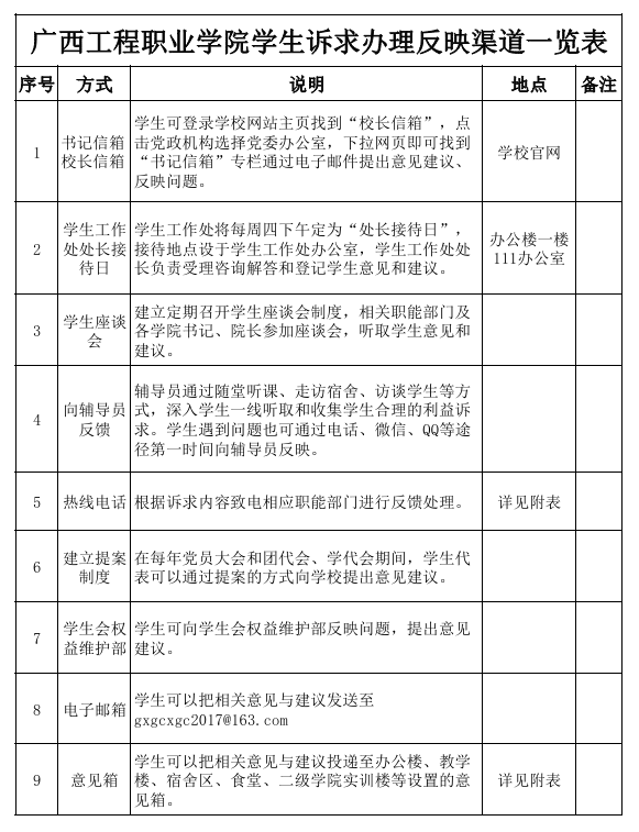 為切實保障學生訴求信息渠道暢通,切實解決學生反饋問題與訴求,經(jīng)研究,在校內(nèi)設立9個反饋渠道,主動對接、及時回應學生相關訴求?,F(xiàn)將相關反饋渠道已通知如下: