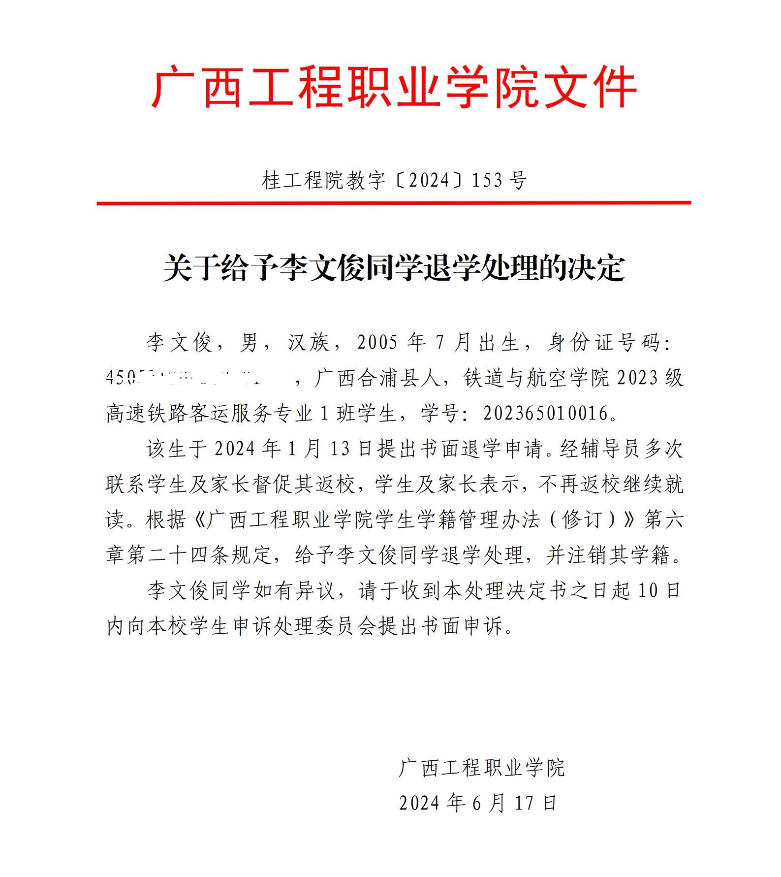 根據(jù)《普通高等學校學生管理規(guī)定》(教育部令第41號)、《廣西工程職業(yè)學院學生學籍管理辦法(修訂)》第二十四條規(guī)定,給予李文俊同學退學處理,并注銷其學籍。