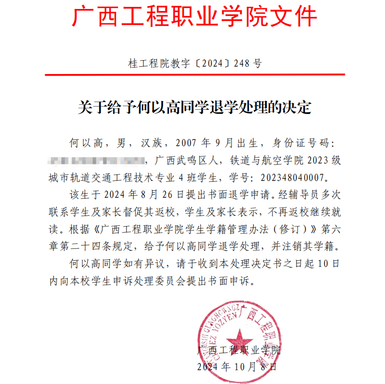 根據《普通高等學校學生管理規(guī)定》(教育部令第41號)、《廣西工程職業(yè)學院學生學籍管理辦法(修訂)》第二十四條規(guī)定,給予何以高同學退學處理,并注銷其學籍。