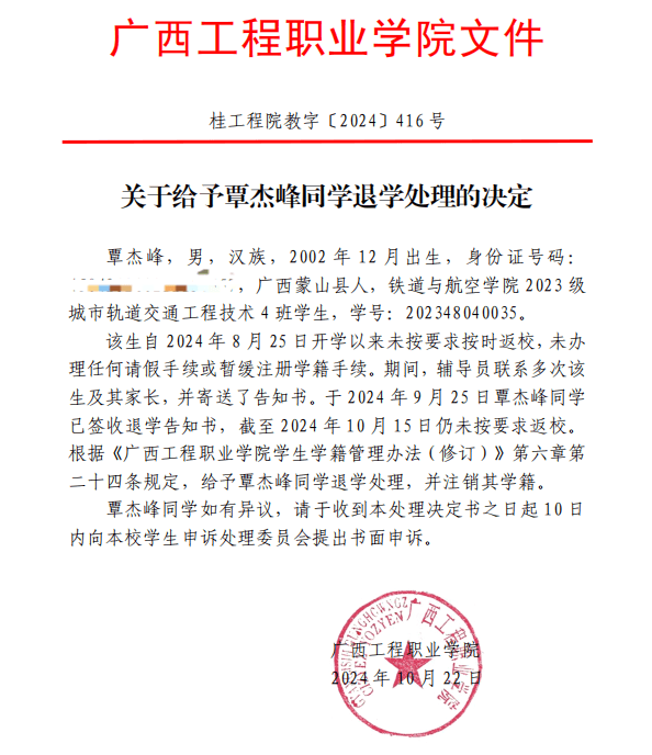 根據(jù)《普通高等學(xué)校學(xué)生管理規(guī)定》(教育部令第41號(hào))、《廣西工程職業(yè)學(xué)院學(xué)生學(xué)籍管理辦法(修訂)》第二十四條規(guī)定,給予覃杰峰同學(xué)退學(xué)處理,并注銷其學(xué)籍。