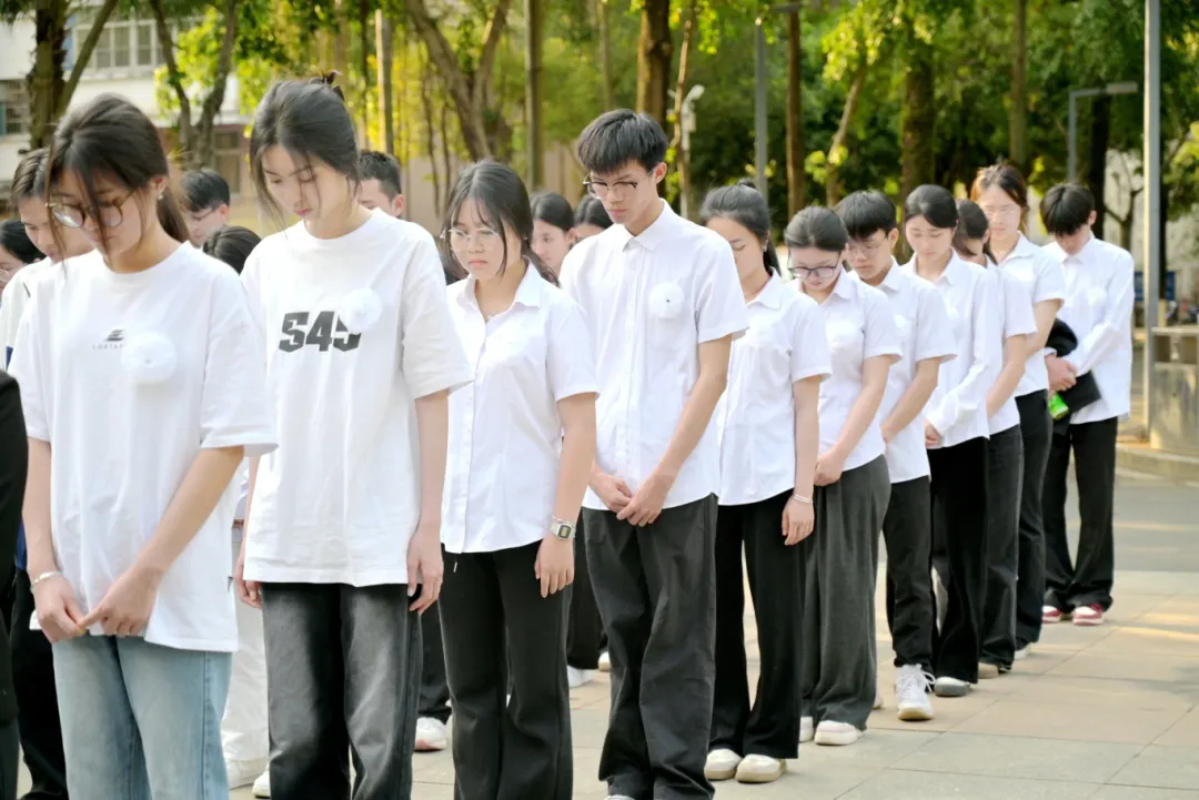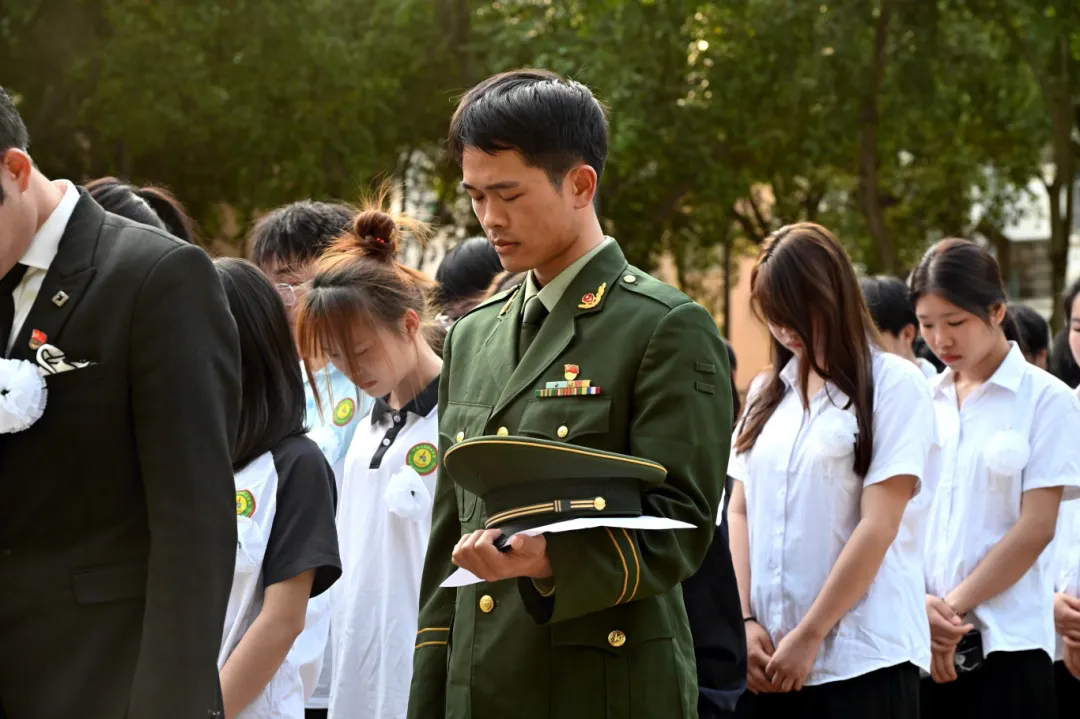 活動開始,全體師生默哀三分鐘,現(xiàn)場一片寂靜仿佛連空氣都凝固了,只有時間在無聲地流逝。如同一條無聲的河流,穿過每個人的心田,思念在靜默中流淌,寄托對英雄先烈的無限追思。