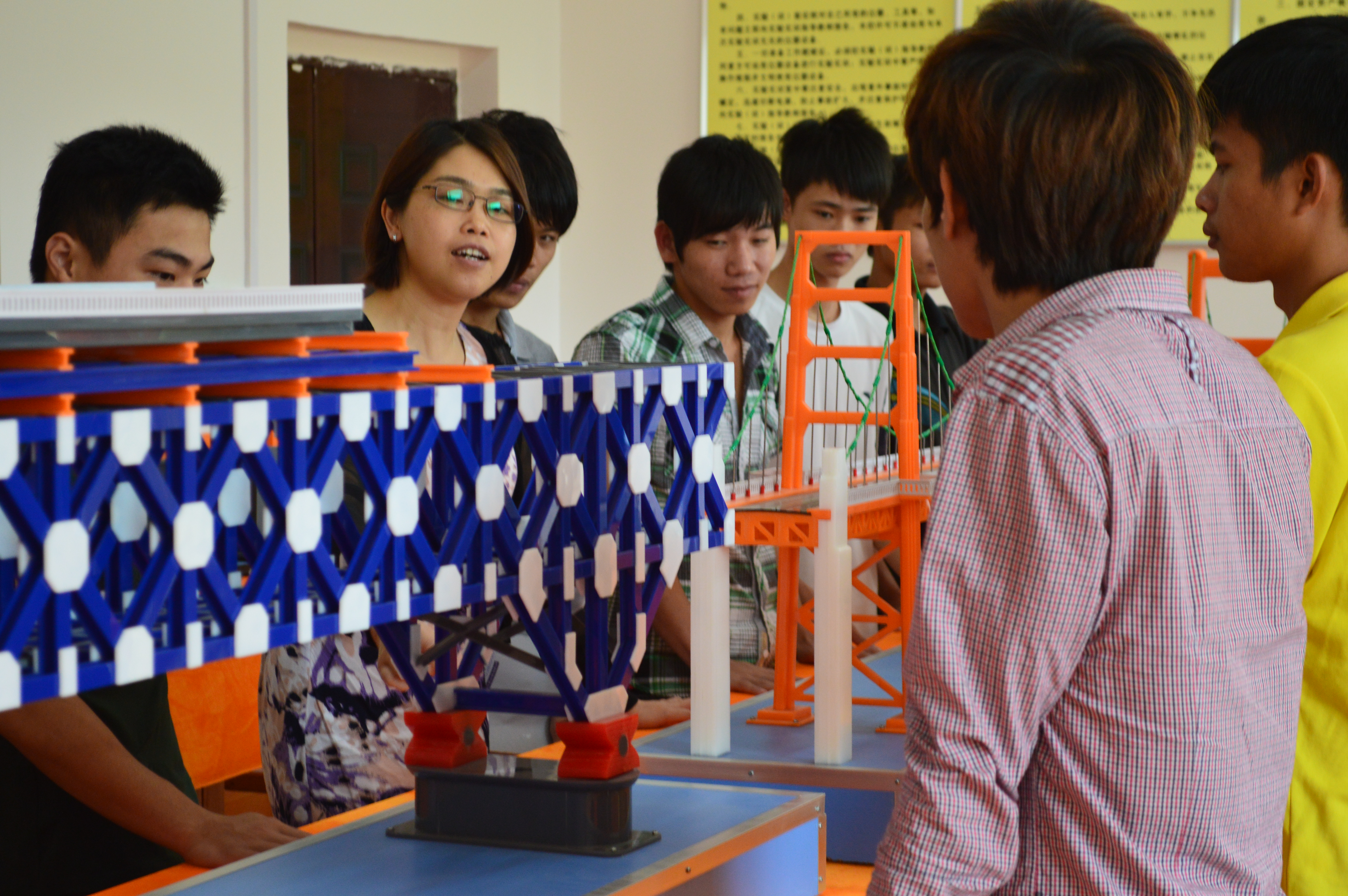 橋梁工程模型室2位于土木工程學(xué)院1號(hào)樓206室,面積約為70平方米,現(xiàn)有趙州橋、南京長(zhǎng)江大橋、裝配T形簡(jiǎn)支梁橋、預(yù)應(yīng)力混凝土組合箱梁橋一般構(gòu)造、重慶長(zhǎng)江公路大橋、江陰長(zhǎng)江大橋(懸索橋)、美國(guó)舊金山金門大橋、橋面鋪裝構(gòu)造(示教板)、橡膠伸縮縫(4種)、裝配式T型梁配筋、盆式橡膠支座、T形梁橋荷載橫發(fā)布實(shí)驗(yàn)?zāi)P停ㄓ袡M隔梁、無(wú)橫隔梁)、各類輕型橋墩(X、V、傾斜式、雙叉式、四叉式、T形等共6種)、樁柱式橋墩、肋形埋置式橋臺(tái)、耳墻式橋臺(tái)、沉井結(jié)構(gòu)、樁基礎(chǔ)等28臺(tái)套設(shè)備。主要面向道路橋梁工程技術(shù)專業(yè)開設(shè)《路基路面》、《道橋施工圖識(shí)圖》、《公路工程組織設(shè)計(jì)》等觀摩課,可同時(shí)容納30名學(xué)生觀摩。