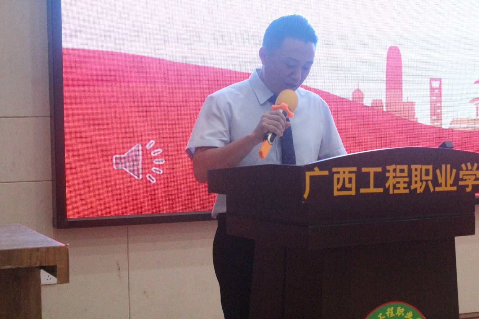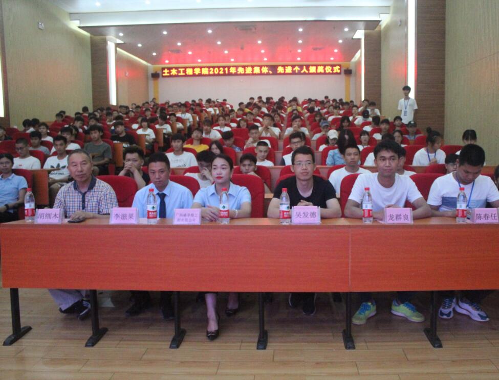2021年6月2日,土木工程學(xué)院在圖文信息大樓一樓學(xué)術(shù)報告廳舉行2021年土木工程學(xué)院先進(jìn)集體、先進(jìn)個人頒獎儀式。出席頒獎儀式的有學(xué)校黨委副書記、副校長胡細(xì)木、特邀嘉賓廣西盛菲煌裝飾工程公司李滋果經(jīng)理、唐艷紅女士、土木工程學(xué)院學(xué)生科科長陳春任、辦公室主任黃連芳、土木工程學(xué)院第一黨支部書記龍群良以及全體教師、部分班級的學(xué)生代表參加了會議。頒獎儀式由學(xué)校黨委委員、土木工程學(xué)院黨總支書記、副院長主持。頒獎會議在全體參會人員奏唱《國歌》中拉開序幕。