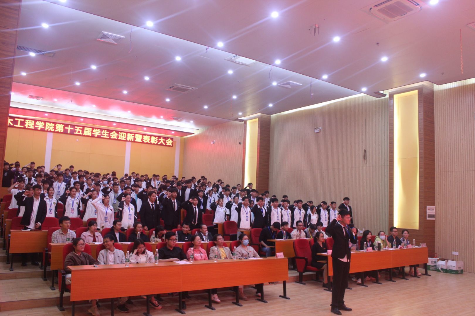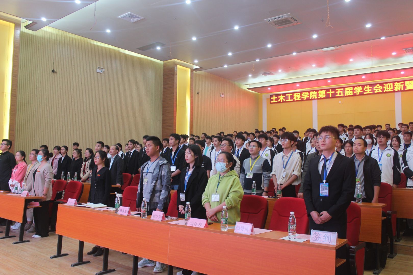 2021年10月28日晚,土木工程學院第十五屆學生會迎新暨表彰大會在圖文信息大樓三樓學術報告廳召開,出席會議的有學校黨委委員、土木工程學院黨總支書記、副院長李麗詩、土木工程學院分團委書記陳春任、辦公室主任黃連芳及全體教師、全體學生會成員、部分班級學生代表。本次會議由2021級新生陳雨歡同學主持。會議在全體參會人員奏唱《共青團團歌》中拉開序幕。