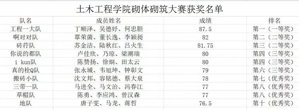 2022年6月12日星期日上午,由土木工程學(xué)院第一黨支部和土木工程學(xué)院學(xué)生會(huì)共同主辦的職業(yè)技能大賽系列活動(dòng)之——砌體砌筑大賽在學(xué)院1號(hào)樓旁舉行。此次比賽主要展現(xiàn)同學(xué)們對(duì)砌體砌筑知識(shí)的理解和應(yīng)用,著力培養(yǎng)同學(xué)們的砌體砌筑興趣、砌體砌筑實(shí)踐應(yīng)用能力,學(xué)校黨委委員、校長(zhǎng)助理蔣茂麗,土木工程學(xué)院學(xué)院副院長(zhǎng)楊竟,土木工程學(xué)院部分教師出席此次比賽,本次比賽由龍群良、韋炳輝、黃小龍、黃照政、牙忠木等老師擔(dān)任評(píng)委。