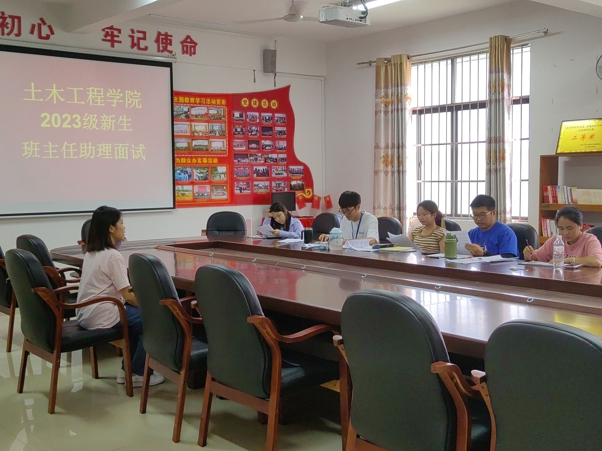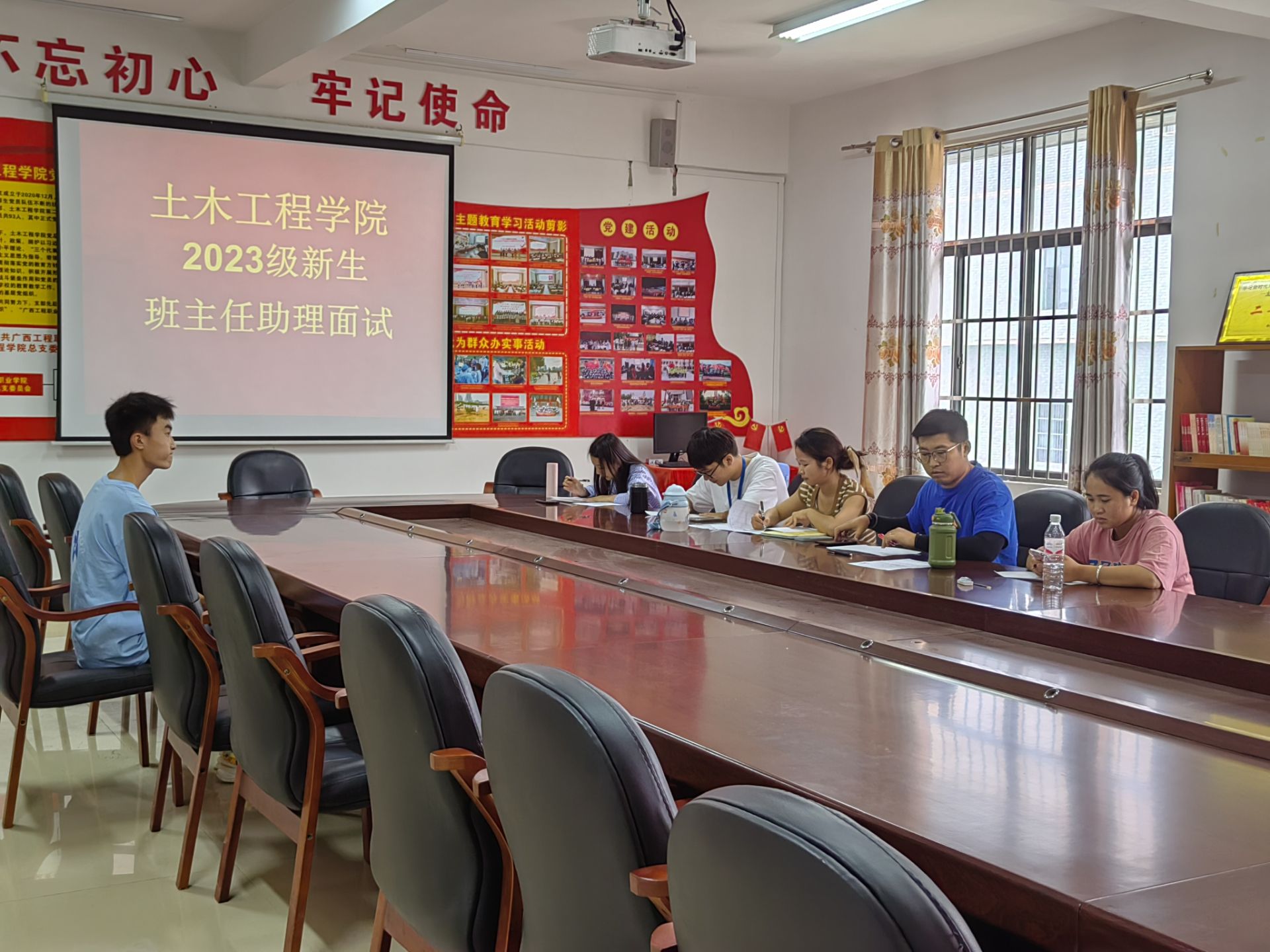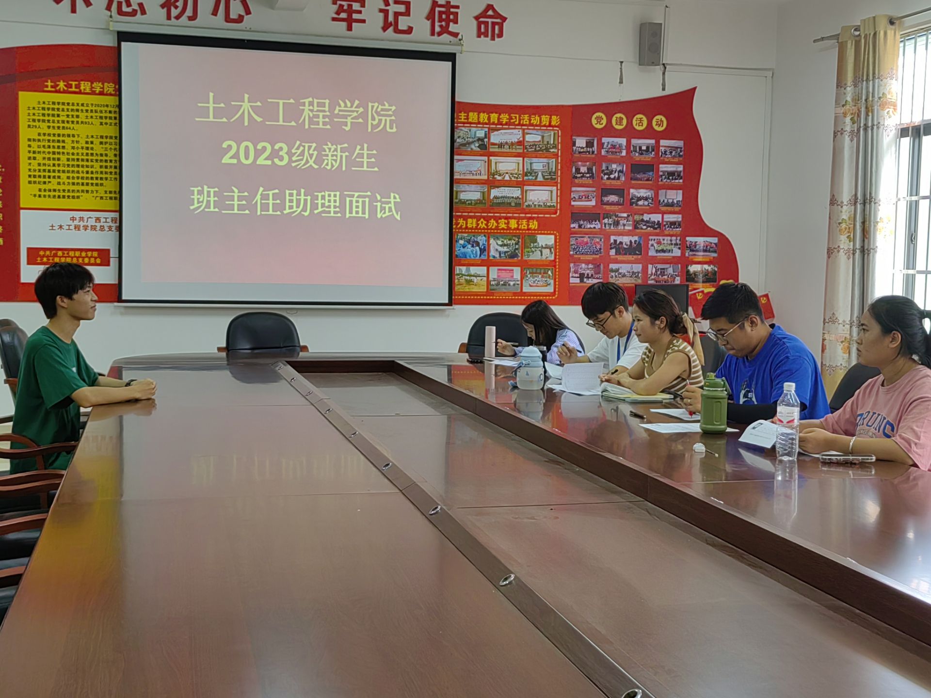 2023年8月29日下午16點(diǎn)30分,土木工程學(xué)院2023級(jí)新生輔導(dǎo)員助理選拔面試在土木工程學(xué)院301會(huì)議室舉行,共有40位同學(xué)參與面試,黃建博老師、陸明梅老師、覃家珍老師、雷其致老師、余慧婷老師擔(dān)任面試評(píng)委。