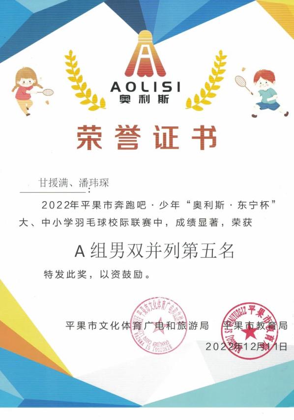 2022年平果市奔跑吧•少年“奧利斯杯•東寧杯”大、中小學(xué)羽毛球校際聯(lián)賽(平果市文化體育廣電和旅游局、平果市教育局主辦)
