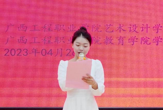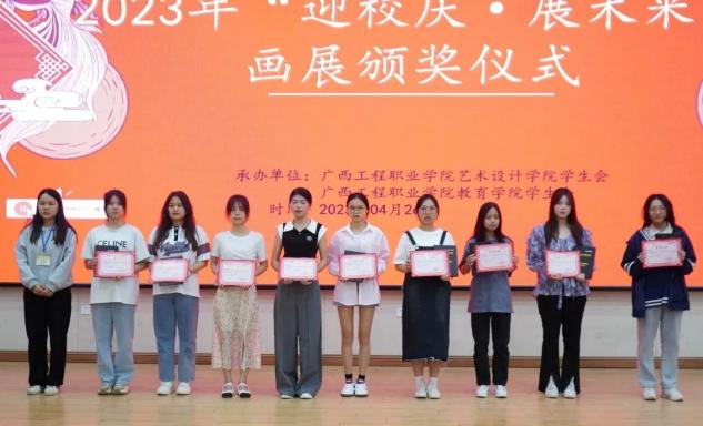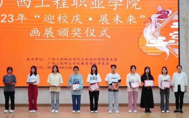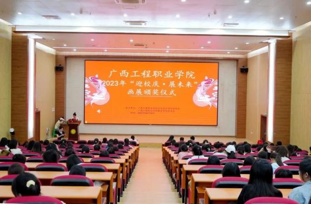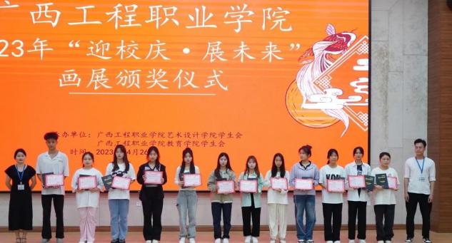 4月26日,廣西工程職業(yè)學(xué)院2023年“迎校慶·展未來”畫展頒獎儀式在圖文信息大樓報(bào)告廳舉行,學(xué)校校長助理梁善雅、藝術(shù)設(shè)計(jì)學(xué)院副院長張清泉、藝術(shù)設(shè)計(jì)學(xué)院黨支部副書記趙志輝、教育學(xué)院學(xué)生科科長李麗清、藝術(shù)設(shè)計(jì)學(xué)院學(xué)生科科長許富城等領(lǐng)導(dǎo)、老師出席頒獎儀式,藝術(shù)設(shè)計(jì)學(xué)院和教育學(xué)院師生代表出席頒獎儀式。頒獎儀式由黃敏同學(xué)主持。