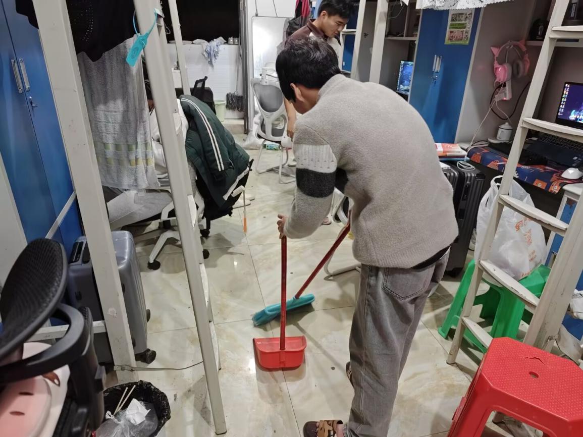 在學(xué)生宿舍區(qū),由輔導(dǎo)員帶隊(duì)到學(xué)生宿舍檢查門窗、水電安全等,并組織同學(xué)們打掃宿舍衛(wèi)生,同學(xué)們對宿舍的每一個(gè)角落都進(jìn)行了細(xì)致的清掃,確保宿舍衛(wèi)生不留死角。