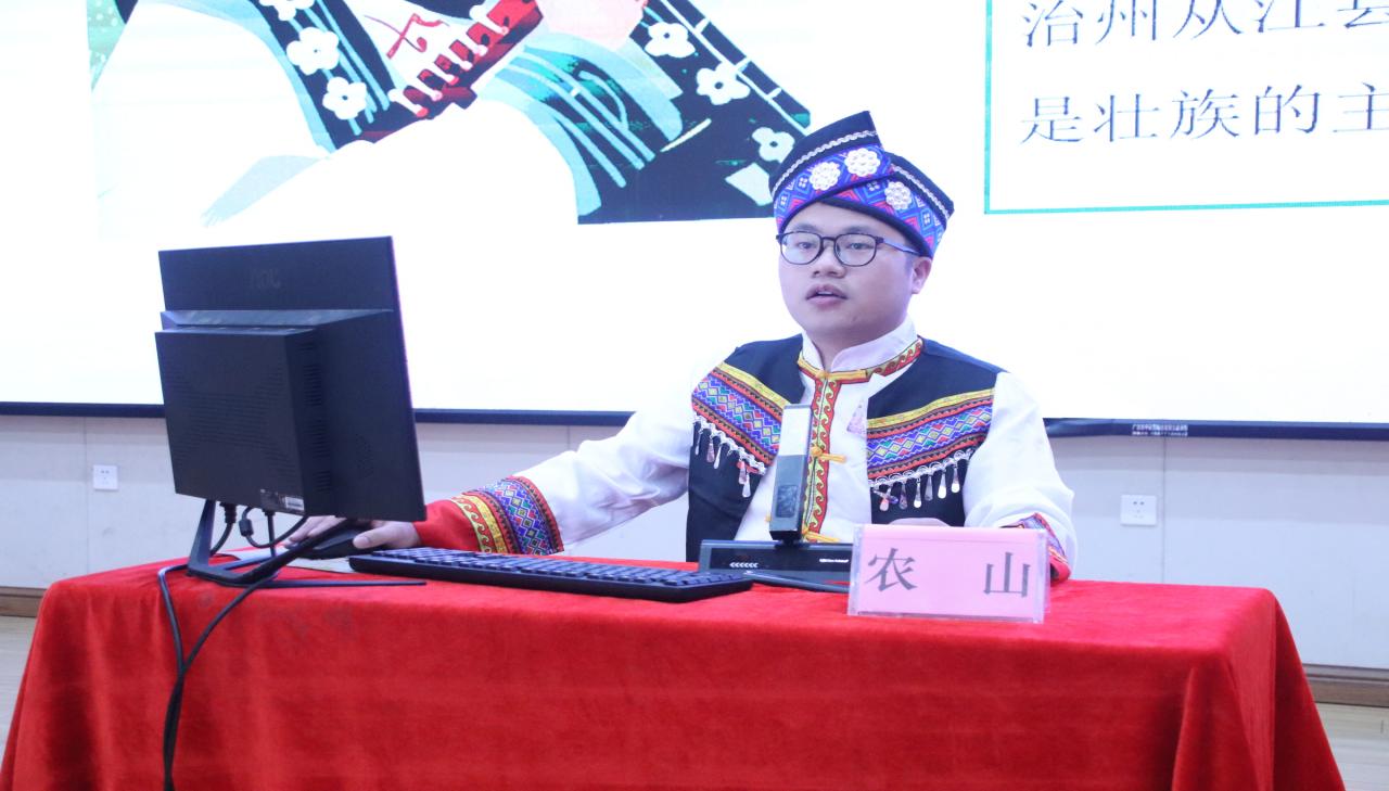 圖為教育學院黨支部宣傳委員農(nóng)山同志作題為《壯族民俗文化》的黨課學習