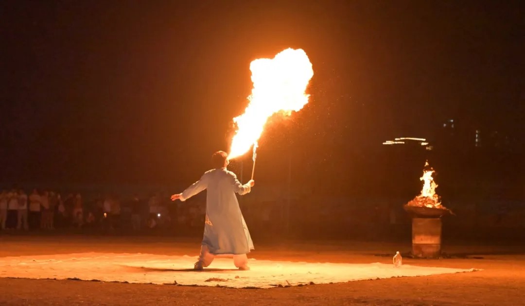 鋒利的火刀在表演者手中被賦予別樣生機,他們熟練地揮舞、翻轉火刀,火焰在刀身燃燒跳躍。