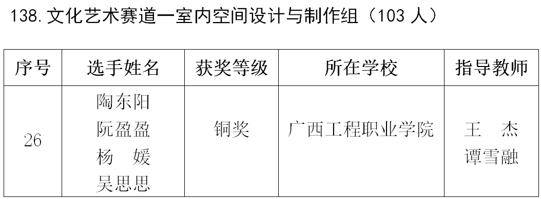 近日,廣西工程職業(yè)學院藝術設計學院組織學子參加2025年廣西職業(yè)院校技能大賽高職組文化藝術賽道—室內(nèi)空間設計與制作組賽項,我院學子憑借扎實的專業(yè)功底、出色的創(chuàng)意設計和默契的團隊協(xié)作,最終斬獲該賽項銅獎,為學校爭得榮譽。
