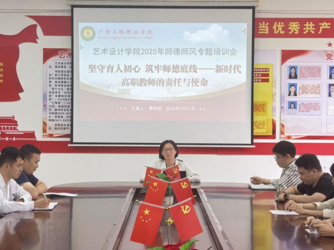 為全面貫徹黨的教育方針,深化新時(shí)代教師隊(duì)伍建設(shè),全面提升教師職業(yè)道德素養(yǎng),強(qiáng)化教師立德樹人的責(zé)任感和使命感,藝術(shù)設(shè)計(jì)學(xué)院于2025年5月27日14:30在學(xué)院三樓黨員活動(dòng)室召開了全體教職工師德師風(fēng)專題培訓(xùn)會(huì)。此次培訓(xùn)會(huì)由學(xué)院黨支部書記、院長(zhǎng)覃鳳姣主講,學(xué)院全體教師參加。