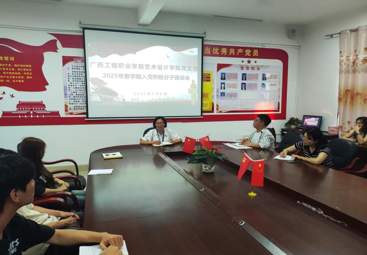 2025年5月8日下午,藝術設計學院黨支部在學院三樓黨員活動室召開2025年春學期入黨積極分子座談會。學院黨支部書記覃鳳姣、副書記趙志輝、宣傳兼統(tǒng)戰(zhàn)委員曹遠翔老師出席本次座談會,與入黨積極分子展開交流。此次座談會旨在進一步加強入黨積極分子的培養(yǎng)教育,引導青年學子堅定理想信念、勇?lián)鷷r代使命。
