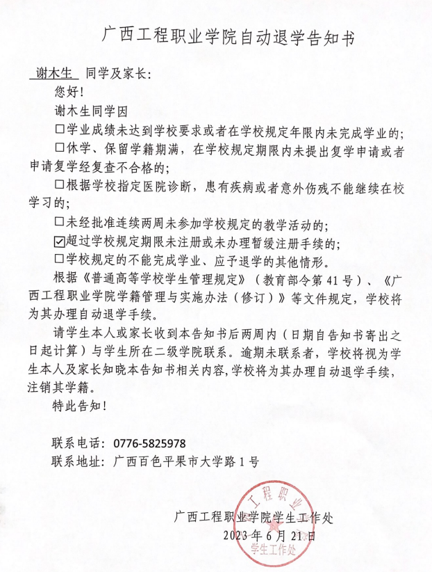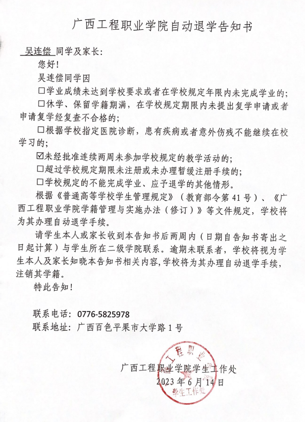 下一篇:廣西工程職業(yè)學(xué)院自動(dòng)退學(xué)告知書/藝術(shù)設(shè)計(jì)學(xué)院