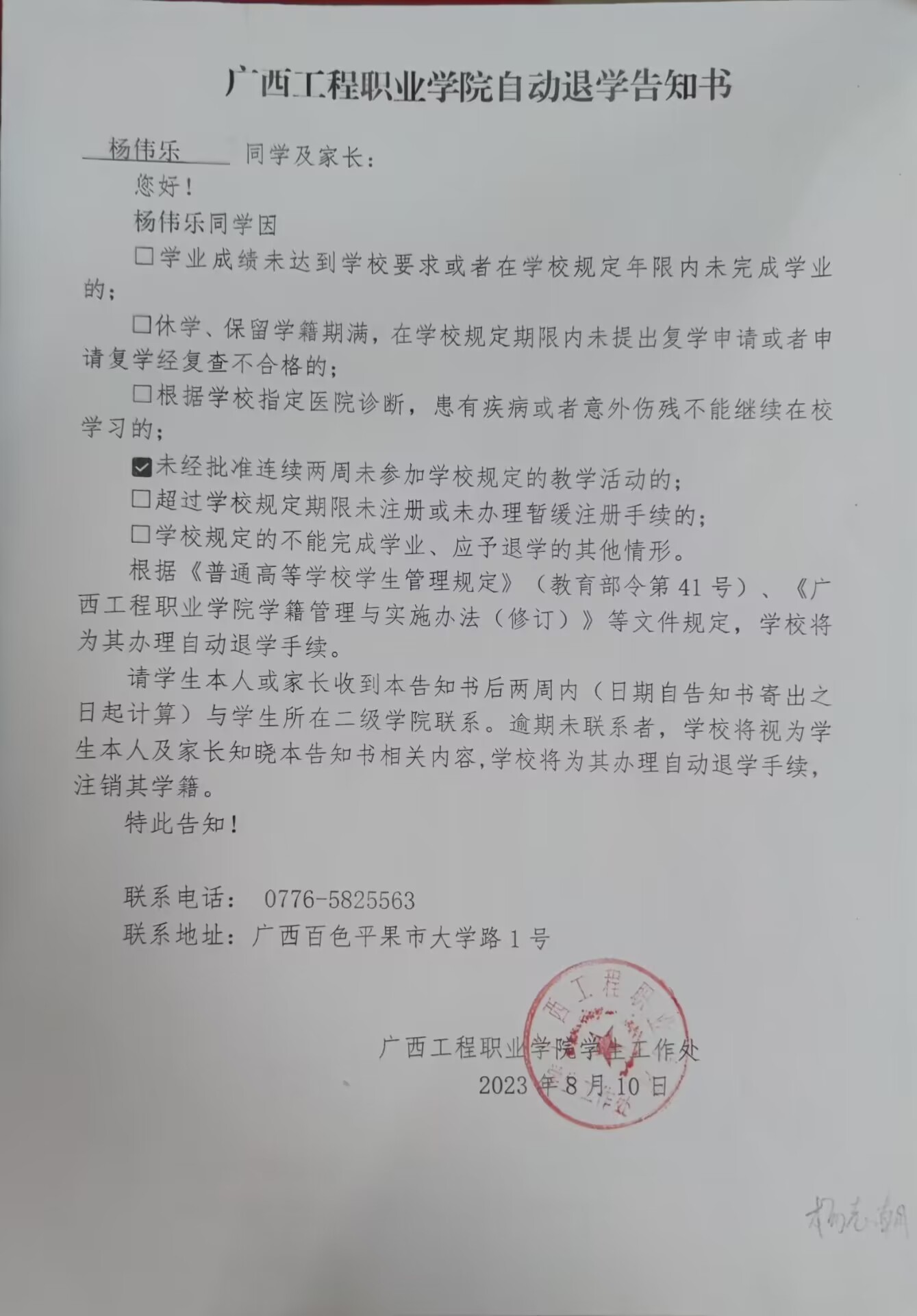 楊偉樂(lè)自動(dòng)退學(xué)告知書(shū)