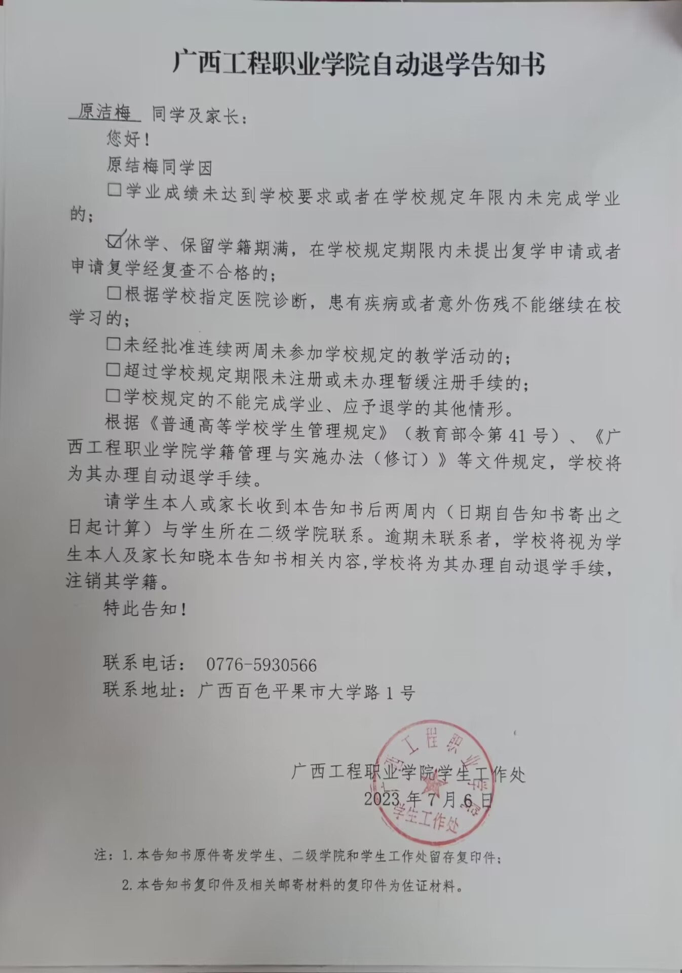 原潔梅自動(dòng)退學(xué)告知書(shū)