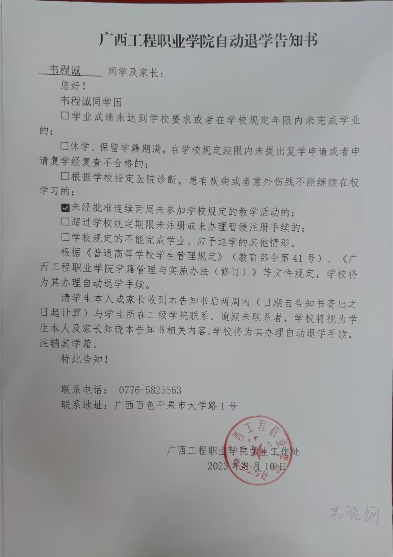 韋程誠(chéng)自動(dòng)退學(xué)告知書(shū)